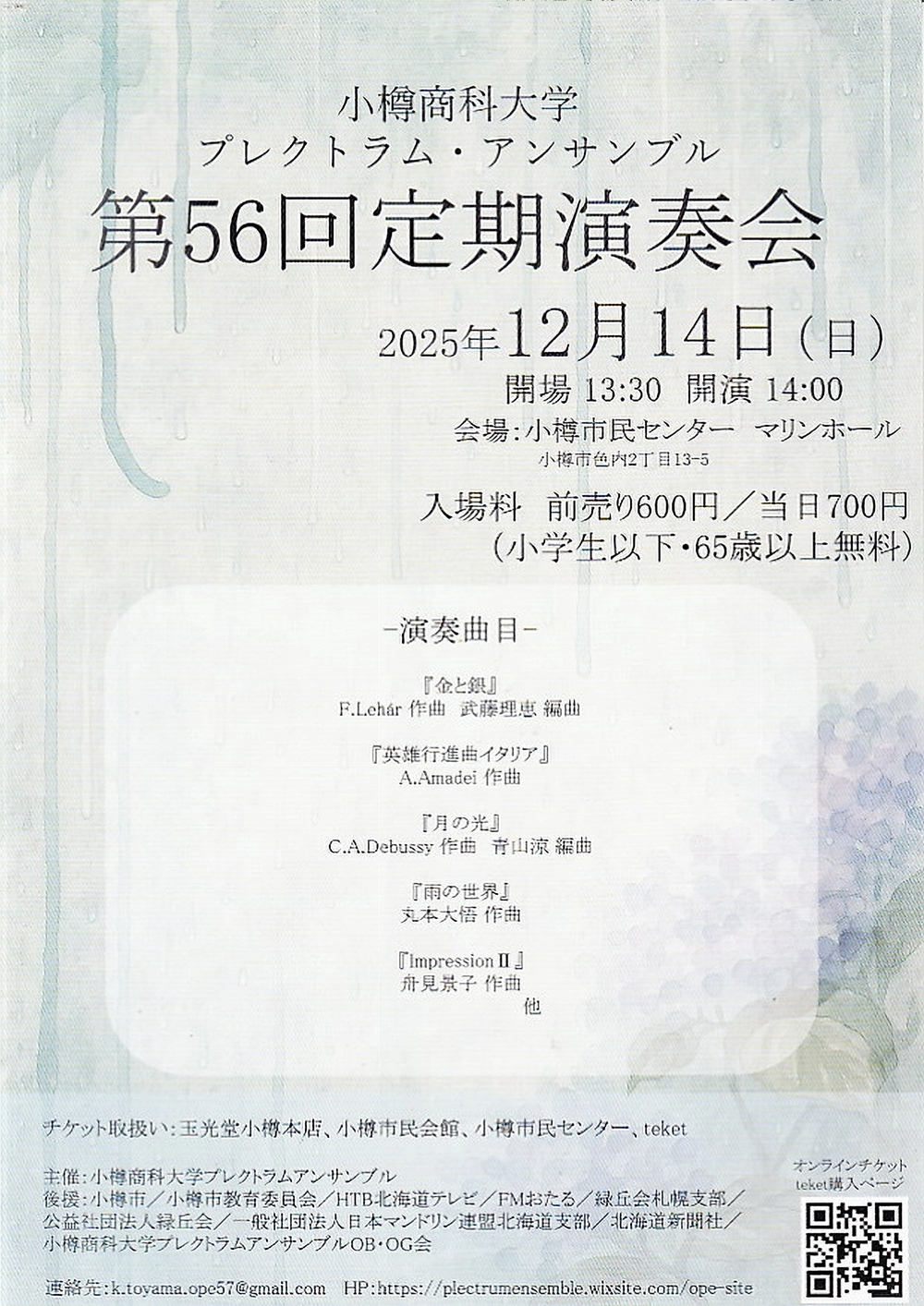 小樽商科大学プレクトラム・アンサンブル 第56回定期演奏会 12月14日(日)14:00 小樽市民センターマリンホール(小樽市色内2丁目13-5) 出演 演奏/小樽商科大学プレクトラム・アンサンブル 曲目 F.Lehar(武藤理恵編曲)/『金と銀』 A.Amadei/『英雄行進曲イタリア』 C.A.Debussy(青山涼編曲)/『月の光』 丸本大吾/『雨の世界』 舟見景子/『ImpressionⅡ』 ……他 |