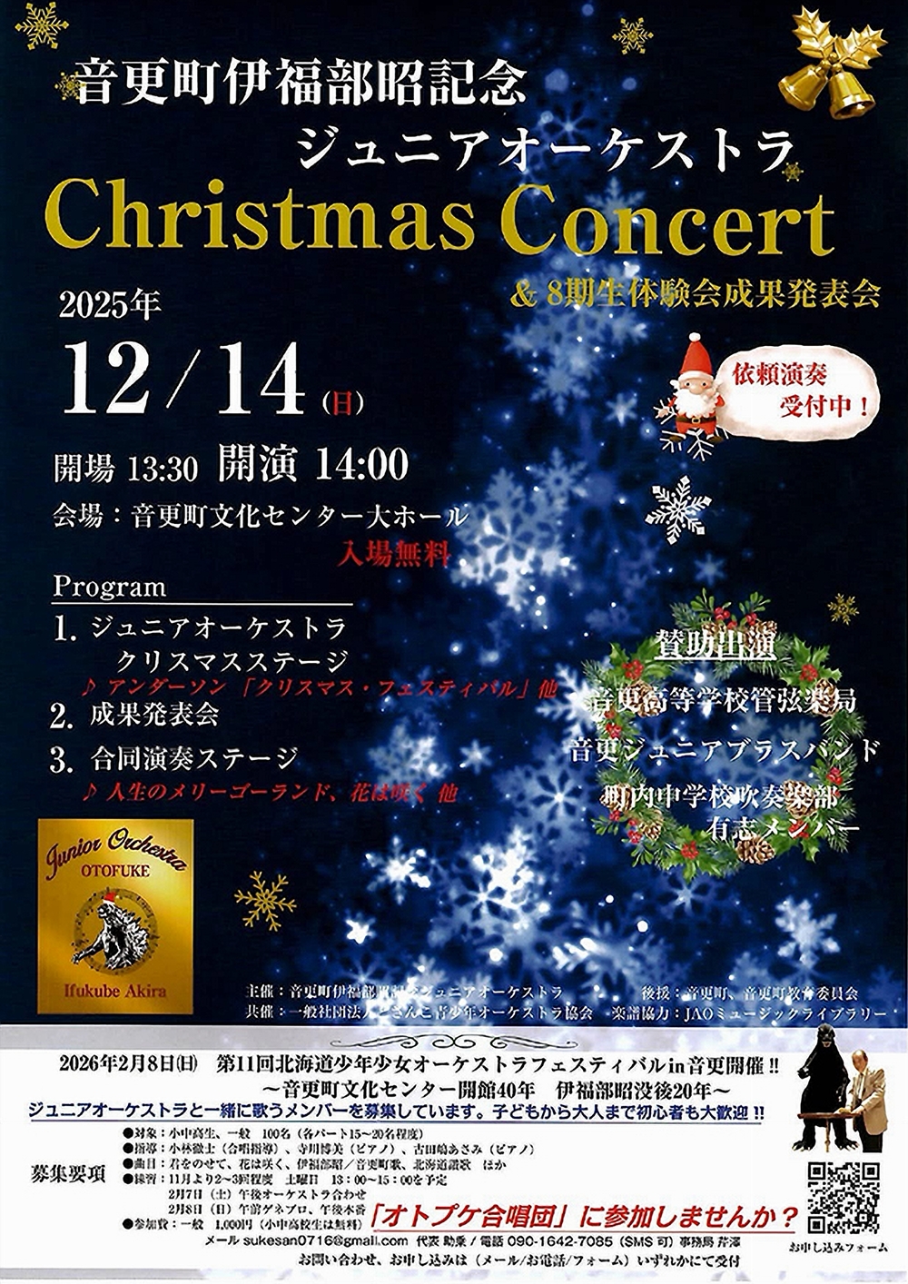 音更町伊福部昭記念ジュニアオーケストラ Christmas Concert &8期生体験会成果発表会 12月14日(日)14:00 音更町文化センター大ホール(河東郡音更町木野西通15丁目8) 出演 管弦楽/音更町伊福部昭記念ジュニアオーケストラ 賛助出演/音更高等学校管弦楽局 音更ジュニアブラスバンド 町内中学校吹奏楽部有志メンバー プログラム 1.ジュニアオーケストラ・クリスマスステージ アンダーソン/『クリスマス・フェスティバル』 他 2.成果発表会 3.合同演奏ステージ 久石譲/映画『ハウルの動く城』メインテーマ「人生のメリーゴーランド」 菅野よう子/花は咲く 他 |