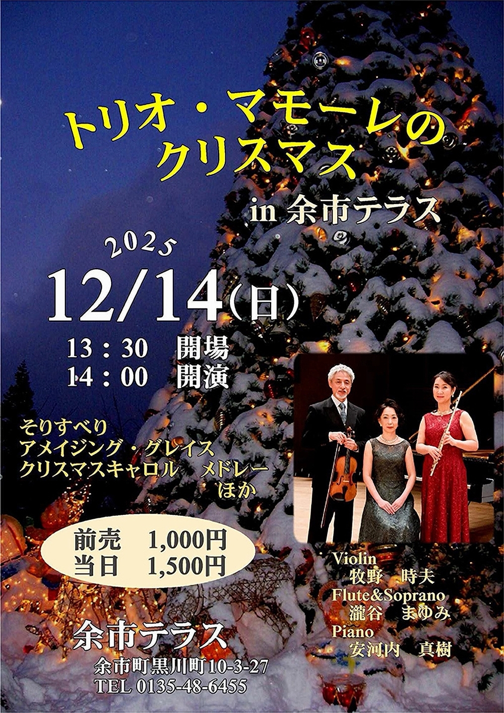 トリオ・マモーレのクリスマスin 余市テラス 12月14日(日)14:00 余市テラス(余市郡余市町黒川町10丁目3-27) 出演 ヴァイオリン/牧野 時夫 フルート&ソプラノ/瀧谷まゆみ ピアノ/安河内真樹 曲目 ルロイ・アンダーソン/そりすべり ジョン・ニュートン/アメイジング・グレイス 三井誠作曲・秋元康作詞/クリスマスキャロル メドレー ……ほか |