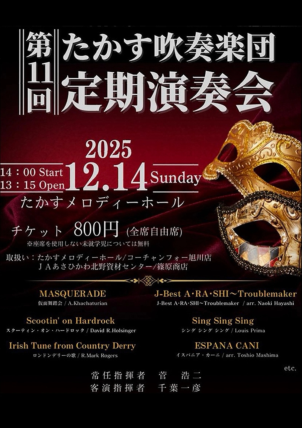 たかす吹奏楽団第11回定期演奏会 12月14日(日)14:00 たかすメロディーホール(上川郡鷹栖町南2条4丁目1-1) 出演 指揮/菅 浩二(常任指揮者) 指揮/千葉 一彦(客演指揮者) 吹奏楽/たかす吹奏楽団 曲目 ハチャトゥリアン/「仮面舞踏会」 arr.Noki Hayashi/J-Best A・RA・SHI~Troublemaker(「嵐」のヒットソングメドレー) デイヴィッド・ホルジンガー/スクーティン・オン・ハードロック ルイ・プリマ/シング・シング・シング フランク・ブリッジ(アイルランド民謡)/「ロンドンデリーの歌」 パスカル・マルキーナ・ナロ/イスパニア・カー二 ……ほか |