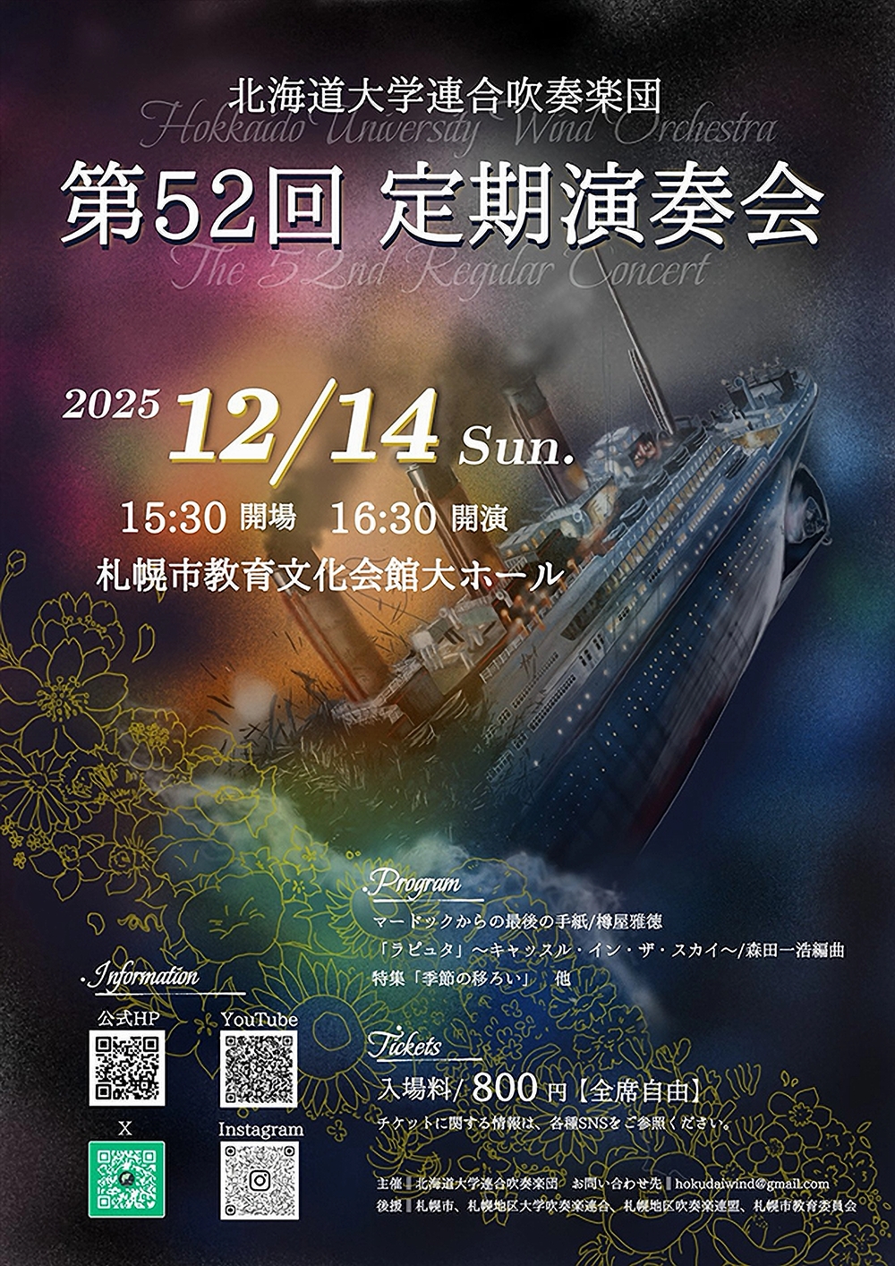 北海道大学連合吹奏楽団第52回定期演奏会 Hokkaido University Wind Orchestra The 52nd Regular Concert 12月14日(日)16:30 札幌市教育文化会館大ホール(札幌市中央区北1条西13丁目7) 出演 吹奏楽/北海道大学連合吹奏楽団 プログラム 樽屋雅徳/マードックからの最後の手紙 久石 譲(森田一浩編曲)/「ラピュタ」~キャッスル・イン・ザ・スカイ~ ピロン/特集「季節の移ろい」 ……他 |