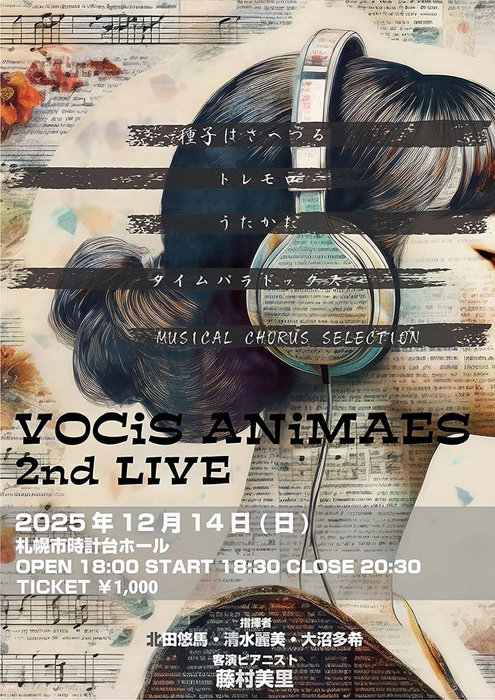 VOCiS ANiMAE2nd LIVE 12月14日(日)18:30 札幌市時計台ホール(札幌市中央区北1条西2丁目) 出演 指揮者/北田 悠馬、清水 麗美、大沼 多希 ピアノ/藤村 美里(客演ピアニスト) 演奏/VOCiS ANiMAE 曲目 信長貴富/種子はさへずる 野田洋次郎/トレモロ 岡千秋/うたかた Vaundy/タイムパラドックス R.ロジャース=O.ハマースタイン2世/MUSICAL CHORUS SELECTION |