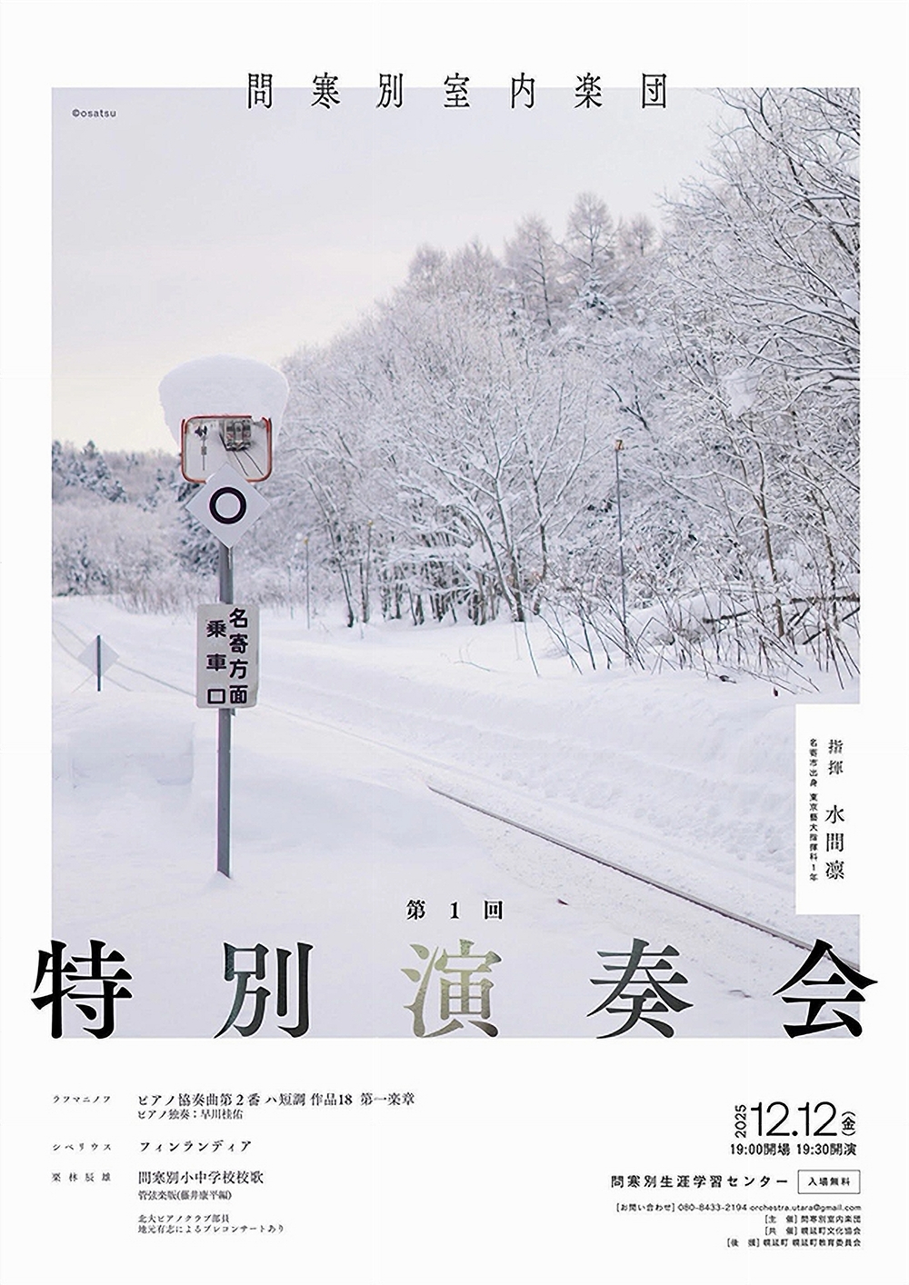 問寒別室内楽団第1回特別演奏会 12月14日(日)19:30 問寒別生涯学習センター(天塩郡幌延町字問寒別135番地の4) 出演 指揮/水間 凛(名寄市出身、東京藝術大学指揮科1年) 弦楽奏/問寒別室内楽団 曲目 ラフマニノフ/ピアノ協奏曲第2番ハ短調作品18第1楽章 シベリウス/フィンランディア 栗林辰雄(藤井康平編)/問寒別小中学校校歌(管弦楽版) |