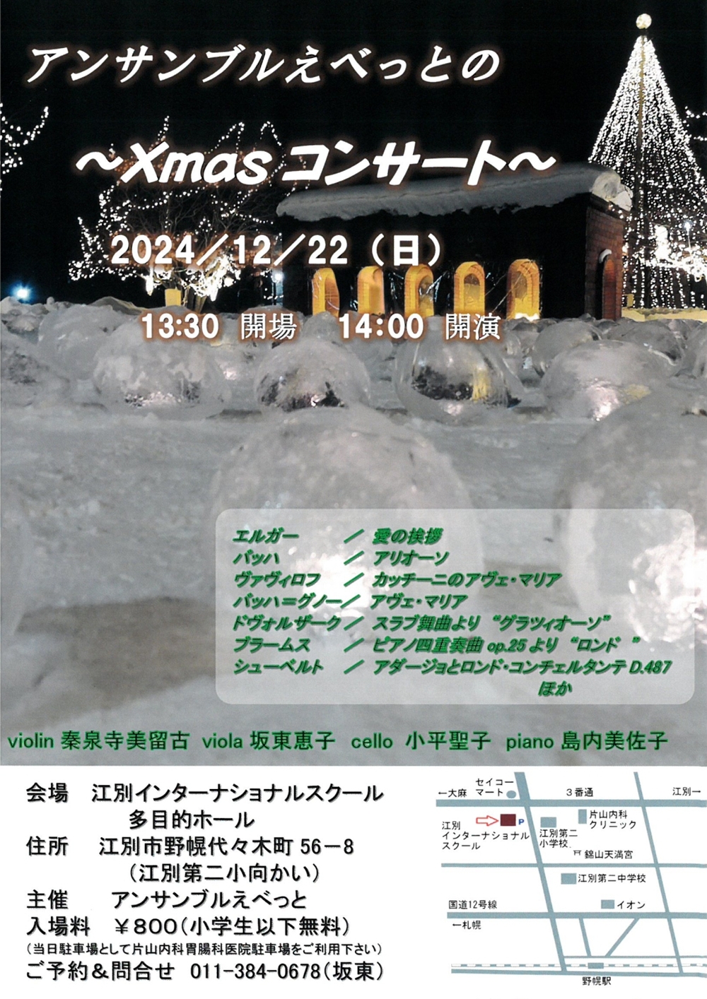 アンサンブルえべっとの~Xmasコンサート~ 12月22日(日)14:00 江別インターナショナルスクール多目的ホール(江別市野幌代々木町56-8) 出演 ヴァイオリン/泰泉寺美瑠古 ヴィオラ/坂東 恵子 チェロ/小平 聖子 ピアノ/島内美佐子 曲目 エルガー/愛の挨拶 バッハ/アリオーソ ヴァヴィロフ/カッチーニのアヴェ・マリア バッハ=グノー/アヴェ・マリア ドヴォルザーク/『スラブ舞曲』より「グラツィオーソ」 ブラームス/『ピアノ四重奏曲Op.25』より「ロンド」 シューベルト/アダージョとロンド・コンチェルタンテD.487 ……ほか |