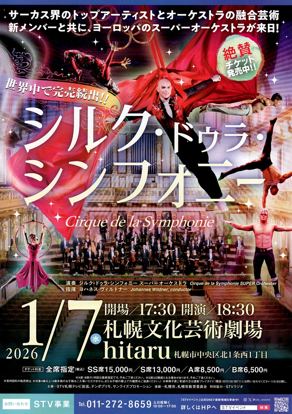 1月7日(水)18:30会場 札幌文化芸術劇場hitaru(札幌市中央区北1条西1丁目札幌市民交流プラザ4階) 出演 芸術監督/アレクサンダー・ストレルソフ エアリアル/ローレン・スターク エアリアル/ウィンドゥ・セイルズ スラックワイヤー,シルホイール/エフゲニー・ヴァシレンコ ストロングマン/セルゲイ・パーシン ストロングマン/アレクサンダー・トルスティコフ 指揮/ヨハネス・ヴィルトナー 管弦楽/シルク・ドゥラ・シンフォニー スーパーオーケストラ プログラム エアリアル・ストラップ:スッペ/軽騎兵序曲 エアリアル・ポール:ファリャ/スペインの踊り ジャグリング:ビゼー/歌劇「カルメン」より リボンダンス:オッフェンバック/天国と地獄 オーケストラ演奏/ヨハン・シュトラウス/美しく青きドナウ、ラデツキー行進曲 ・・・ほか |