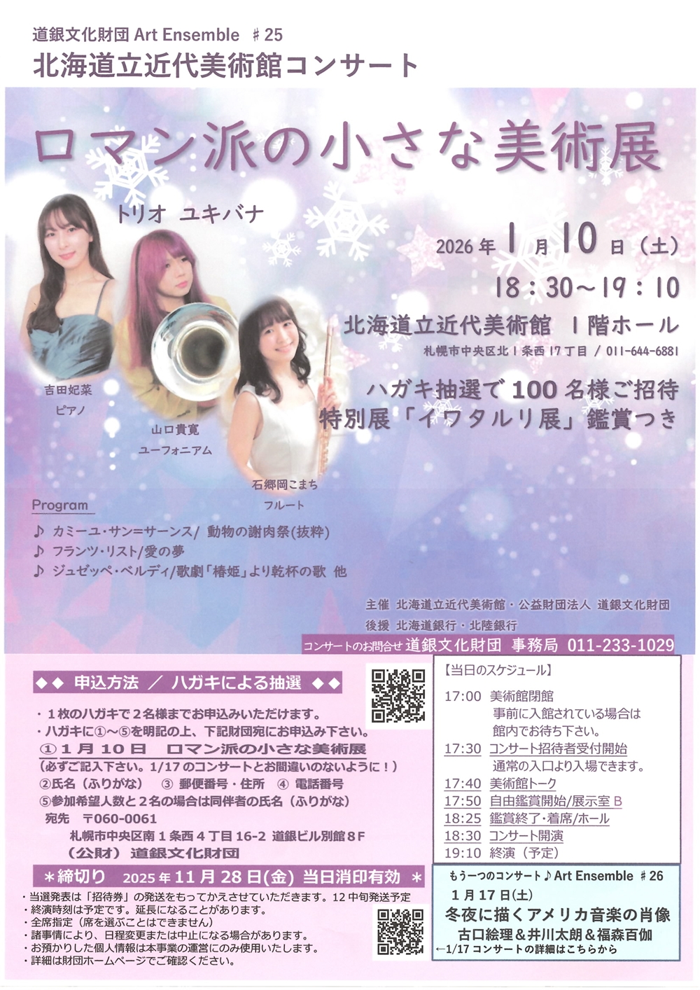 北海道立近代美術館コンサート ロマン派の小さな美術展 1月10日(土)18:30〜19:10 北海道立近代美術館1階ホール(札幌市中央区北1条西17丁目) 出演 ピアノ/吉田 妃菜 ユーフォニアム/山口 貴寛 フルート/石郷岡こまち プログラム カミーユ・サン=サーンス/動物の謝肉祭(抜粋) フランツ・リスト/愛の夢 ジュゼッペ・ベルディ/歌劇『椿姫』より「乾杯の歌」 ……他 |