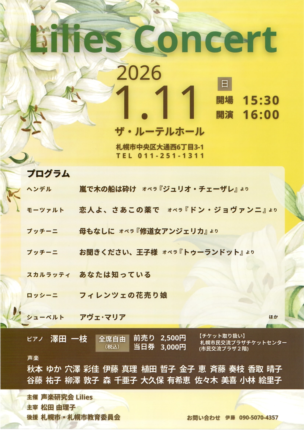 1月11日(日)16:00 ザ・ルーテルホール(札幌市中央区大通西6丁目3-1) 出演 ピアノ/澤田 一枝 声楽/秋本 ゆか、穴澤 彩佳、伊藤 真理、植田 哲子、金子 恵、斉藤 奏枝、香取 晴子、谷藤 祐子、 柳澤 敦子、森 千亜子、大久保有希恵、佐々木美喜、小林絵里子 プログラム ヘンデル/オペラ『ジュリオ・チェーザレ』より「嵐で木の船は砕け」 モーツァルト/オペラ『ドン・ジョバンニ』より「恋人よ、さあこの薬で」 プッチーニ/オペラ『修道女アンジェリカ』より「母もなしに」 プッチーニ/オペラ『トゥーランドット』より「お聞きください、王子様」 スカルラッティ/あなたは知っている ロッシーニ/フィレンツェの花売り娘 シューベルト/アヴェ・マリア |