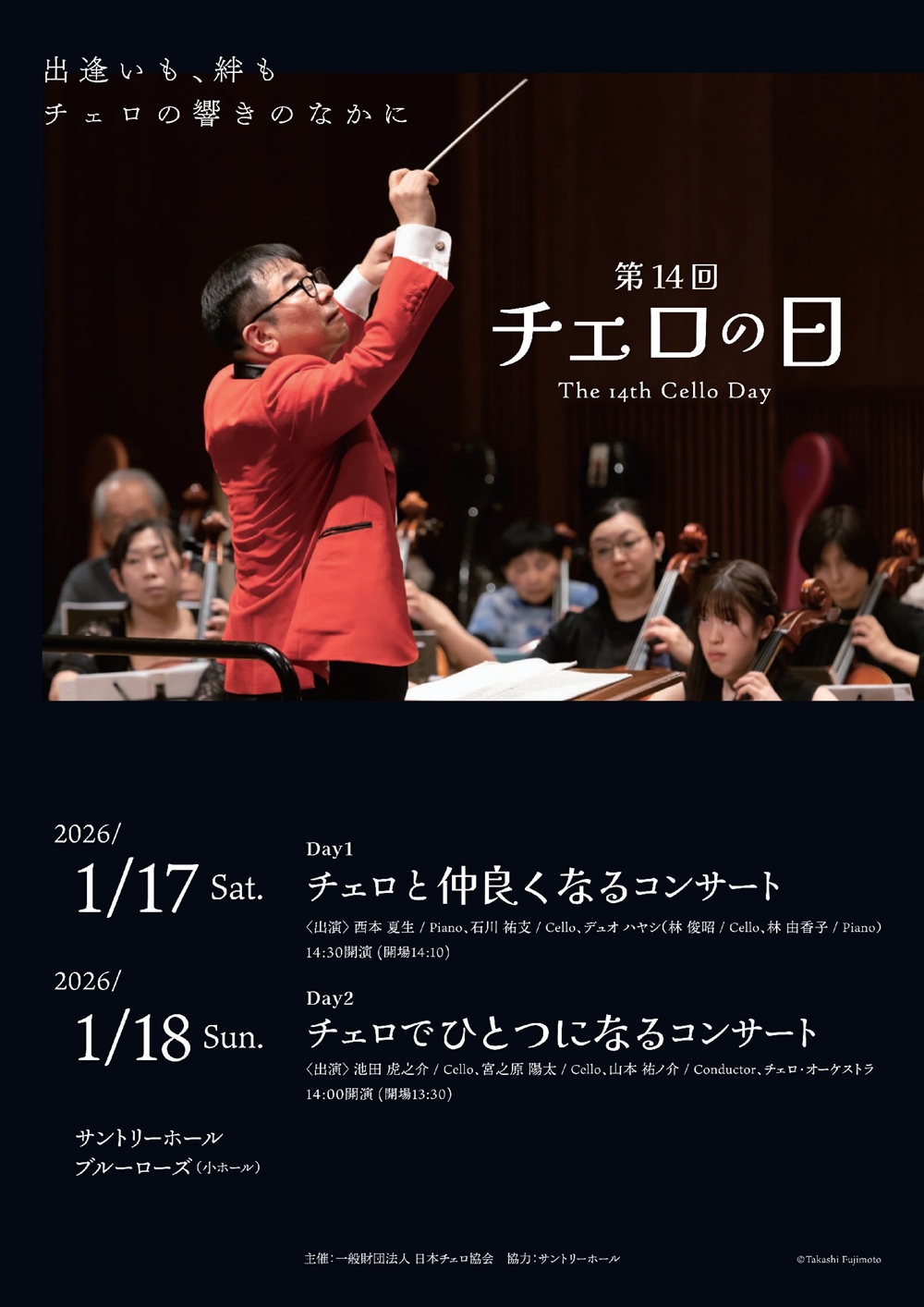 第14回チェロの日The 14th Cello Day 1月17日(土)Day1 14:30 1月18日(日)Day2 14:00 サントリーホールブルーローズ(小ホール。東京都港区赤坂1丁目13-1) 出演者・演奏曲 Day1 チェロと仲良くなるコンサート 第1部 ピアノ/西本 夏生 チェロ/石川 祐支(札響チェロ首席奏者) G.カサド/親愛なる言葉 M.ファリャ/7つのスペイン民謡 ・・・他 第2部 デュオ ハヤシ チェロ/林 俊昭 ピアノ/林 由香子 G.F.マリピエロ/ソナティナ(1942年) F.チレアチェロとピアノのためのソナタニ長調Op.38 Day2 チェロでひとつのなるコンサート 第1部 チェロ/池田虎之介 A.バッカス/ラプソティック・バラード チェロ/宮原 陽太 G.カサド/無伴奏チェロ組曲 第2部 コンダクター/山本祐ノ介 演奏/チェロ・オーケストラ H.ヴィラ=ロボス/ブラジル風バッハ第1番より P.カザルス/東方の三賢人、サルダーナ、カニグーの星マルタン祭 G.ビゼー(山本祐ノ介編曲)/オペラ『カルメン』より「ハバネラ」 E.シャブリエ(石島栄一編曲)/ハバネラ |