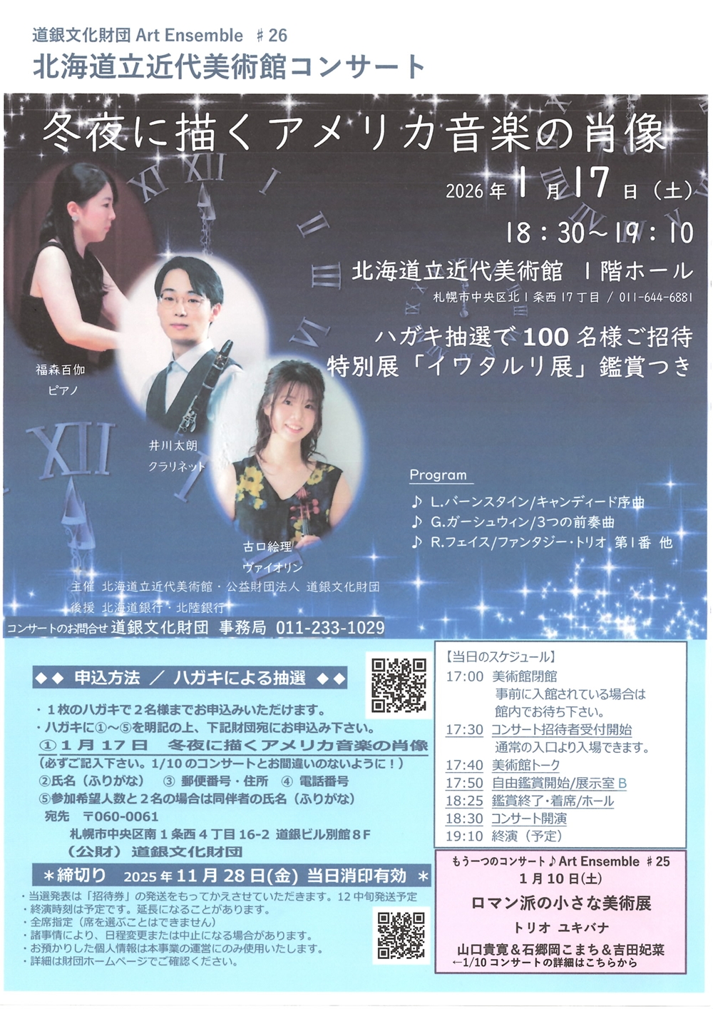 北海道立近代美術館コンサート 冬夜に描くアメリカ音楽の肖像 1月17日(土)18:30〜19:10 北海道立近代美術館1階ホール(札幌市中央区北1条西17丁目) 出演 ピアノ/福森 百伽 クラリネット/井川 太朗 ヴァイオリン/古口 絵理 プログラム L.バーンスタイン/キャンディード序曲 G.ガーシュイン/3つの前奏曲 R・フェイス/ファンタジー・トリオ第1番 ……他 |