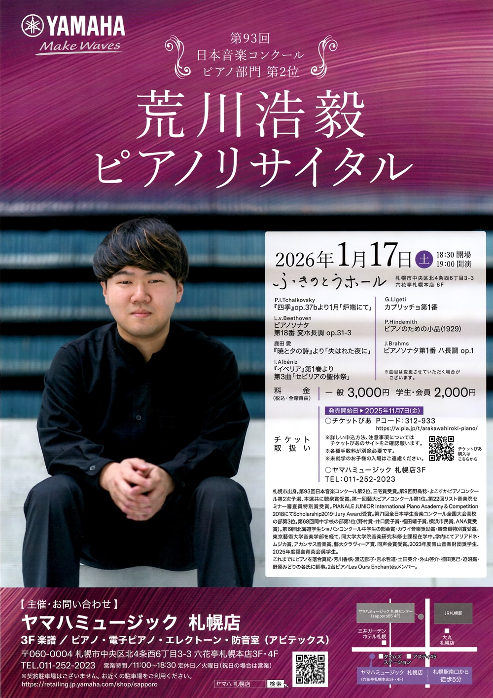荒川浩毅 ピアノリサイタル 1月17日(土)19:00 ふきのとうホール(札幌市中央区北4条西6丁目3-3六花亭札幌本店6階) 出演 ピアノ/荒川 浩毅 曲目 R.I.チャイコフスキー/『四季』Op.37bより「炉端にて」 L.v.ベートヴェン/ピアノ・ソナタ第18番変ホ長調Op.31-3 鹿田 愛/『暁と夕の時』より「失はれた夜に」 T.アルベニス/『イベリア』第1巻より第3曲「セビリアの聖体祭」 G.リゲティ/カプリッチョ第1番 P.ヒンデミット/ピアノのための小品(1929) J.ブラームス/ピアノ・ソナタ第1番ハ長調Op.1 |