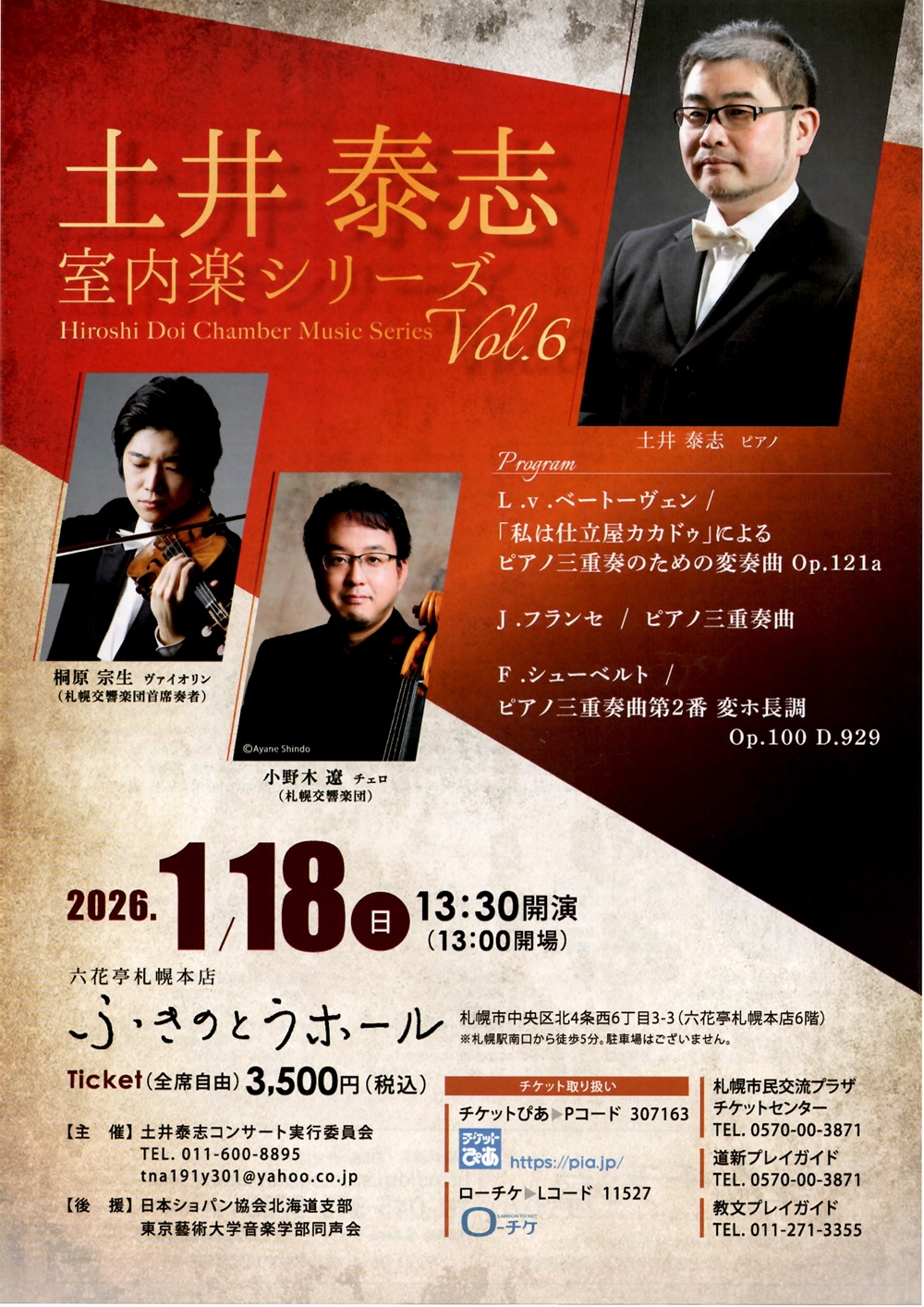 室内楽シリーズVol.6 1月18日(日)13:30 ふきのとうホール(札幌市中央区北4条西6丁目3-3六花亭札幌本店6階) 出演 ピアノ/土井 泰志 ヴァイオリン/桐原 宗生(札響ヴァイオリン首席奏者) チェロ/小野木 遼(札響チェロ奏者) 曲目 L.v.ベートーヴェン/「私は仕立て屋カカドゥ」によるピアノ三重奏のための変奏曲Op.121a J.フランセ/ピアノ三重奏曲 F.シューベルト/ピアノ三重奏曲第2番変ホ長調Op.100 D.929 |