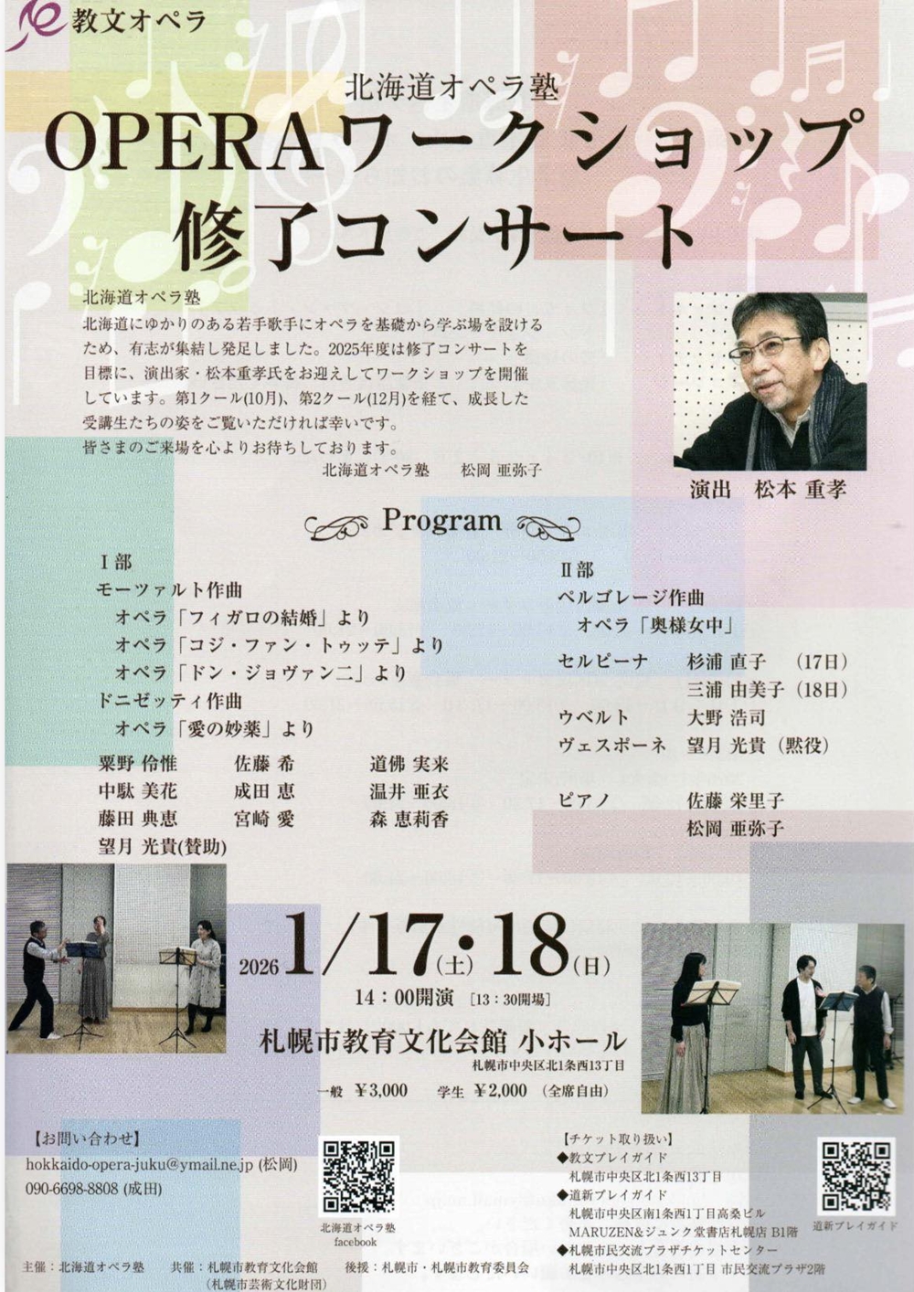 教文オペラ北海道オペラ塾OPERAワークショップ 修了コンサート 1月17日(土)・18日(日)各14:00 札幌市教育文化会館小ホール(札幌市中央区北1条西13丁目7) 出演 演出/松本 重孝(フリー演出家) 粟野 伶惟、佐藤 希、道佛 実来、中駄 美花、成田 恵、温井 亜衣、藤田 典恵、宮崎 愛、 森 恵莉香、望月 光貴(賛助) プログラム T部 モーツァルト/オペラ「フィガロの結婚」より オペラ「コジ・ファン・トゥッテ」より オペラ「ドン・ジョバンニ」より ドニゼッティ/オペラ「愛の妙薬」より U部 ベルゴレージ/オペラ「奥様女中」 セルピーナ/杉浦 直子(17日)、三浦由美子(18日) ウベルト/大野 浩司 ヴェスポーネ/望月 光貴(黙役) ピアノ/佐藤栄里子、松岡亜弥子 |
