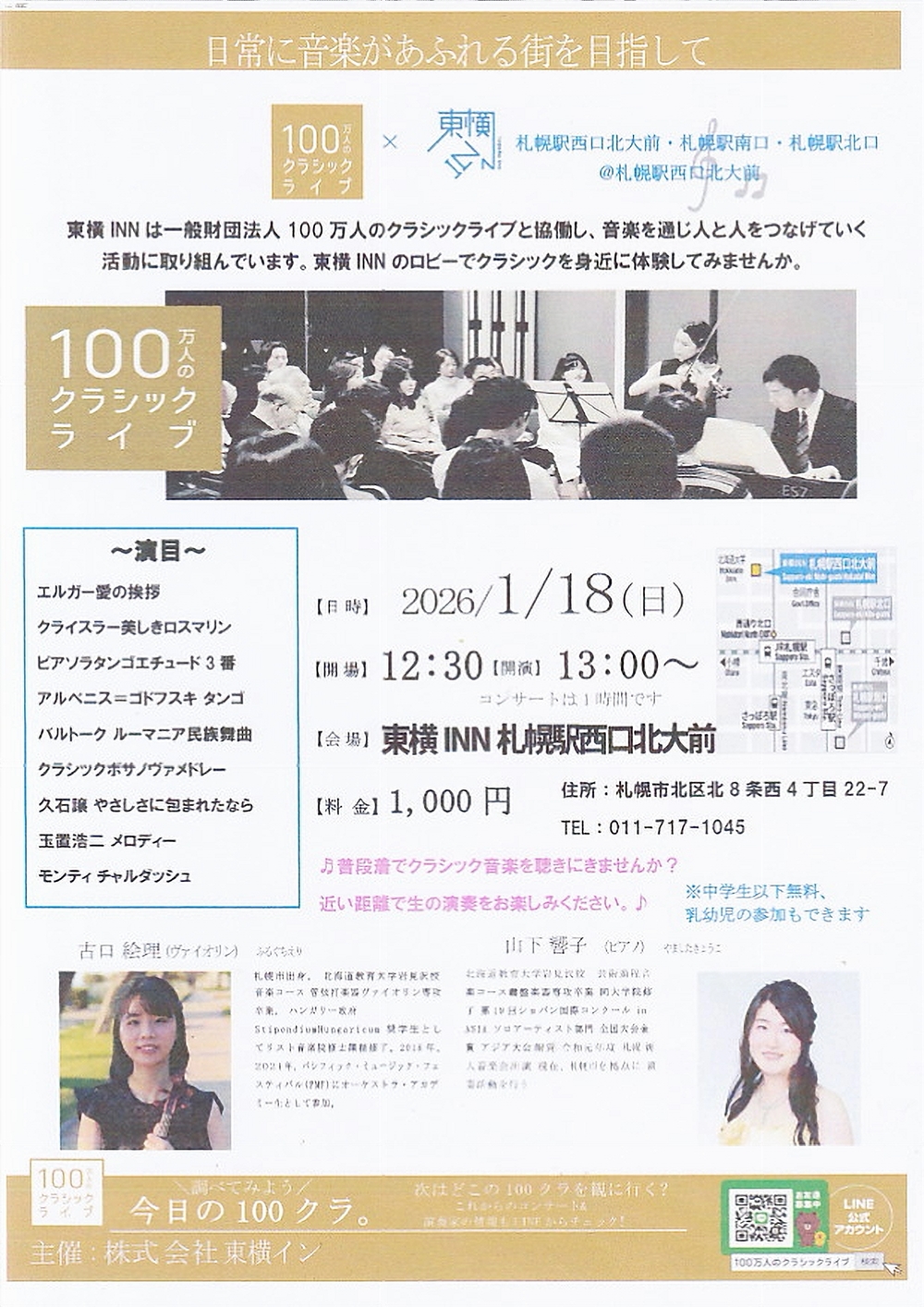 日常に音楽があふれる街を目指して百万人のクラシックライブ × 東横INN札幌駅西口北大前 1月18日(日)13:00 東横INN札幌駅西口北大前(札幌市北区北8条西4丁目22-7 出演 ヴァイオリン/古口 絵理(アンサンブルグループ奏楽) ピアノ/山下 響子(フリーランスピアニスト) 曲目 エルガー/愛の挨拶 クライスラー/美しきロスマリン ピアソラ/タンゴエチュード3番 アルベニス=ゴドフスキ/タンゴ バルトーク/ルーマニア民族舞曲 クラシックボサノヴァメドレー 久石譲/やさしさに包まれたのなら 玉置浩二/メロディー モンティ/チャルダッシュ |