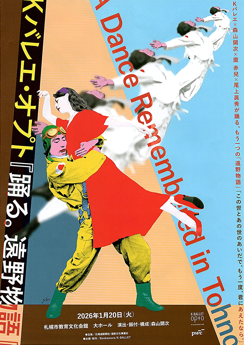 『踊る。遠野物語』 「会いたい、話したい、無性に。」 1月20日(火)18:30 札幌市教育文化会館大ホール(札幌市中央区北1条西13丁目7) 出演 キャスト 大久保沙耶(K-BALLET TOKYOソリスト) 石橋 奨也(K-BALLET TOKYOプリンシバル) 麿 赤兒 他K-BALLET TOKYO 尾上 眞秀 田中陸奥子 森山 開次 村松 卓矢(大駱駝艦) 松田 篤史(大駱駝艦) 小田 直哉(大駱駝艦) 奥山ばらば 水島晃太郎 小川 莉伯 スタッフ 演出・振付・構成/森山 開次 企画/高野 泰樹 舞台美術・衣装/眞田 岳彦 音楽監督・作曲・尺八演奏/中村 明一 作曲/吉田 潔、アーヴィット・オルソン 箏演奏/磯貝 真紀 宣伝美術/横尾 忠則、森 洋子 歌/菊池 マセ 写真/渡邉 肇 ヘアメイク/渡辺 多絵 |