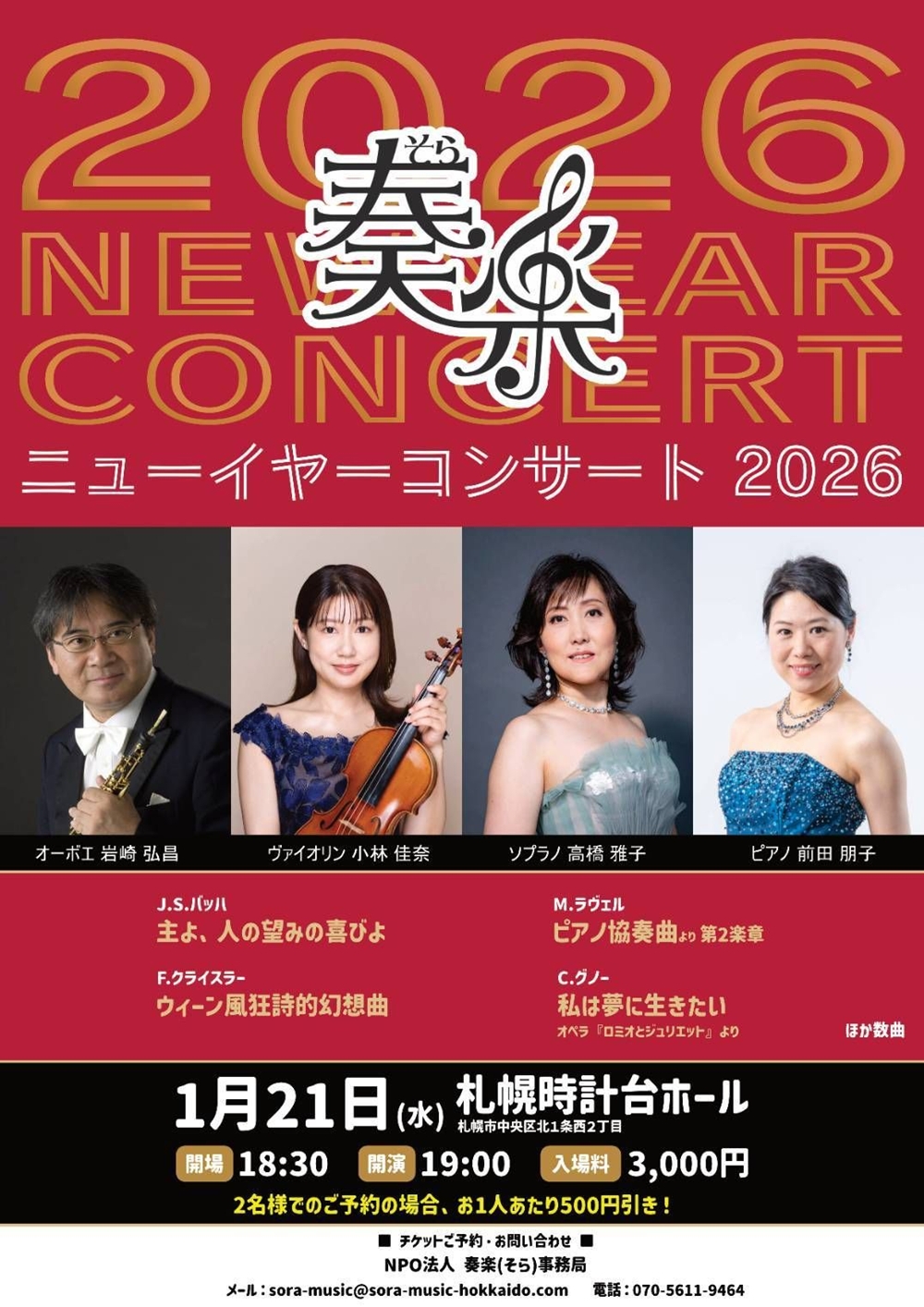 2026 NEW YEAR CONCERT奏楽(そら) ニューイヤーコンサート2026 1月21日(水)19:00 札幌市時計台ホール(札幌市中央区北1条西2丁目) 出演 オーボエ/岩崎 弘昌(NPO法人奏楽理事長) ヴァイオリン/小林 佳奈 ソプラノ/高橋 雅子 ピアノ/前田 朋子 曲目 J.S.バッハ/主よ、人の望みの喜びよ M.ラヴェル/『ピアノ協奏曲』より「第2楽章」 F.クライスラー/ウィーン風狂詩的幻想曲 C.グノー/オペラ『ロミオとジュリエット』より「私は夢に生きたい」 ほか数曲 |