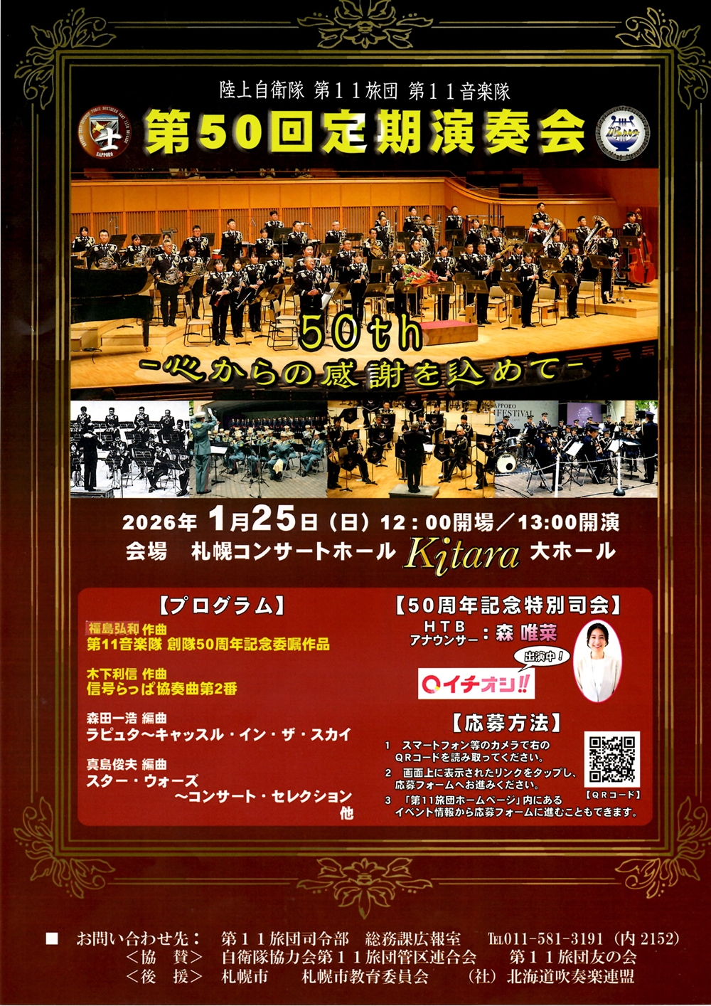 第50回定期演奏会 >50th心から感謝を込めて 1月25日(日)13:00 札幌コンサートホールKitara大ホール 出演 吹奏楽/陸上自衛隊第11旅団第11音楽隊 50周年記念特別司会/森 唯菜(HTBアナウンサー) プログラム 福島弘和作曲/第11音楽隊創隊50周年記念委嘱作品 木下利信作曲/信号らっぱ協奏曲第2番 森田一浩編曲/ラピュタ〜キャッスル・イン・ザ・スカイ 間島俊夫編曲/スター・ウォーズ〜コンサート・セレクション ……他 |