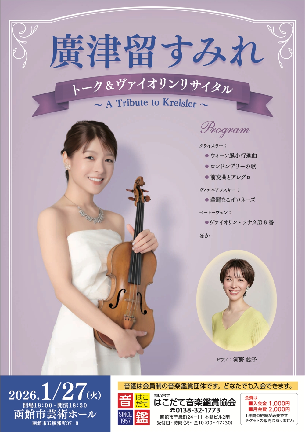 廣津留すみれトーク&ヴァイオリンリサイタル 函館公演 1月27日(火)18:30 函館市芸術ホール(函館市五稜郭町37-8) 出演 トーク&ヴァイオリン/廣津留すみれ(国際教養大学特任准教授) ピアノ/河野 博子 Program クライスラー/ウィーン風小行進曲 クライスラー/ロンドンデリーの歌 クライスラー/前奏曲とアレグロ ヴィエニアフスキー/華麗なるポロネーズ ベートーヴェン/ヴァイオリンソナタ第8番 ……ほか |