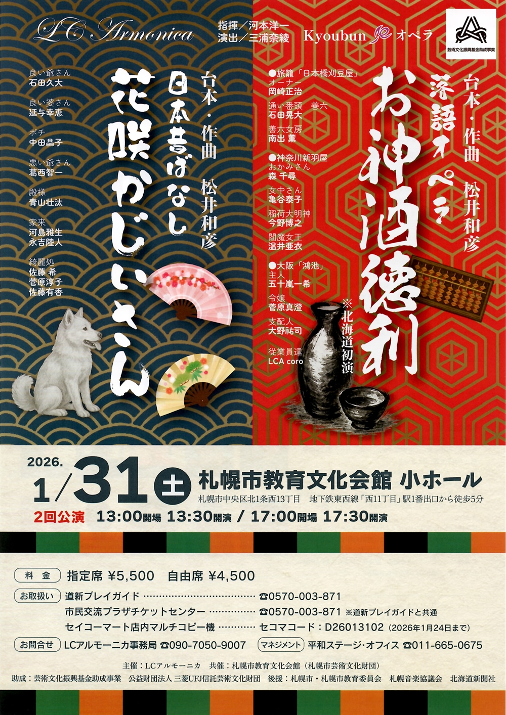 LC・Armonica Kyoubunオペラ落語オペラ「お神酒徳利」 & 日本昔ばなし「花咲かじいさん」 1月31日(土)@13:30 A17:30 札幌市教育文化会館小ホール(札幌市中央区北1条西13丁目) キャスト 御神酒徳利(北海道初演):台本・作曲/松井 和彦 旅籠「日本梱刈豆屋」刈豆屋(オーナー)/両崎 正治 通い番頭善六/石田 晃大 善六の女房/南出 薫 旅龍「神奈川新羽屋」おかみさん/森 千尋 女中さん/亀谷 泰子 稲荷大明神/今野 博之 閻魔女王/温井 亜衣 大阪(鴻池)主人/村山 武来 令嬢/菅原 真澄 支配人/大野 祐司 ガードマン/未定 従業員たち/LCAcoro20人 花咲かじいさん:台本・作曲/松井 和彦 良い爺さん/石田 久大 良いばあさん/延与 幸恵 ポチ/中田 晶子 悪い爺さん/葛西 智一 殿/青山 壮汰 家来/河島 雅生、永吉 陸人 奇麗処3人/佐藤 希、菅原 淳子、佐藤 有香 スタッフ 指揮/河本 洋一 演出/三浦 奈綾 演出補/山田かおり ピアノ/守屋 亜樹、藤原 恭子、宮永 弘美、久保上頼子 打楽器/笠井 尚貴 管弦楽/LC・Armonica 舞台美術/ステージアンサンブル 照明/秋野 良太(HAS) ヘアメイク/藤原 宏行 衣装/賀集 友子 舞台監督/山田かおり 動画撮影/piccoropalco 合唱/LCAcoro ソプラノ/石田かのん、小石 直美、二階堂ひさえ、藤島 好花、松澤 真凛 アルト:上坂美穂子、菅原 淳子、福田 聡子、増 子優子 テナー/油谷 一徳、五十嵐一希、佐久間和良、照井 大地 バス/河島 雅生、中明 宏道、永吉 陸人 コレペティトール/守屋 亜樹、久保上頼子、藤原 恭子、宮永 弘美 打楽器/菊池朋 尋(ステージアンサンブル) |