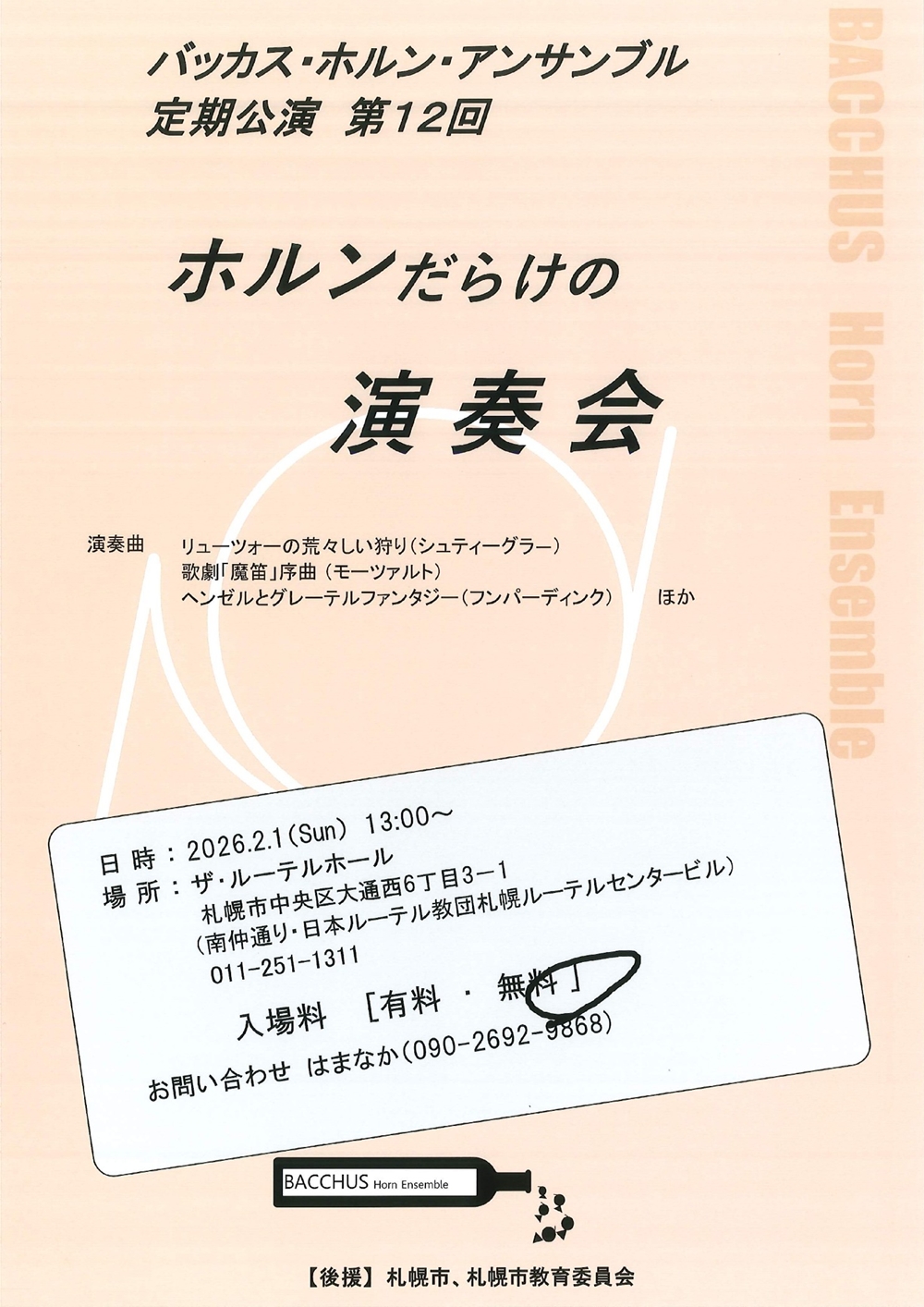 バッカス・ホルン・アンサンブル定期公演第12回 ホルンだらけの演奏会 2月1日(日)13:00 ザ・ルーテルホール(札幌市中央区大通西6丁目3-1) 出演 演奏/バッカス・ホルン・アンサンブル 曲目 シュティーグラ-/リューツォーの荒々しい狩り モーツァルト/歌劇「魔笛」序曲 フンパーディンク/ヘンゼルとグレーテルファンタジー …ほか |