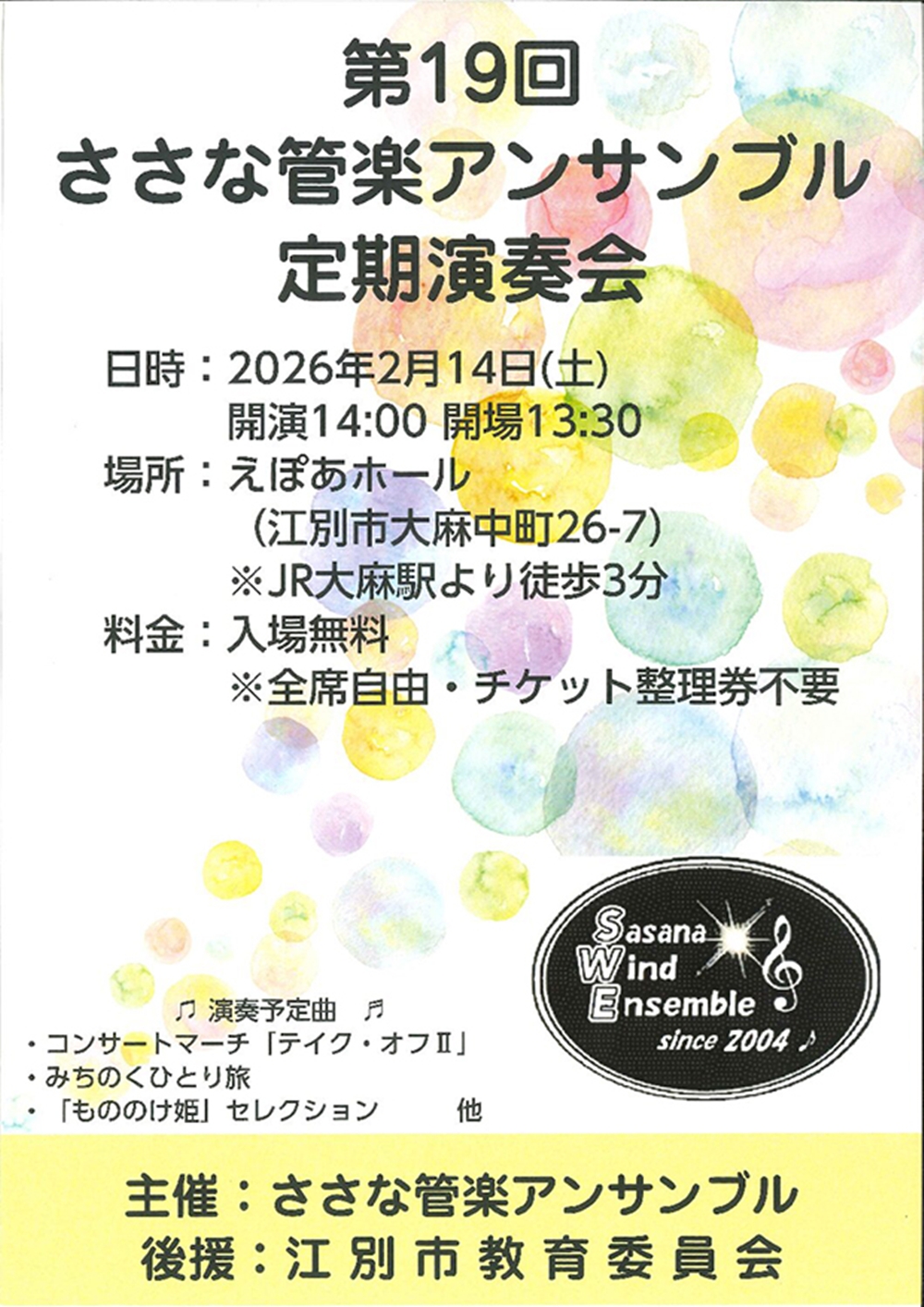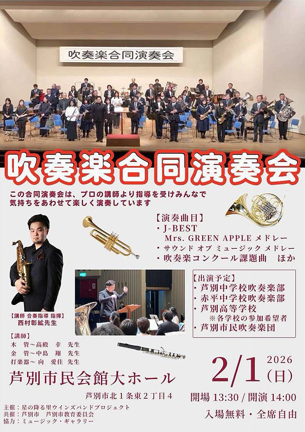 吹奏楽合同演奏会2月1日(日)14;00 芦別市民会館大ホール(芦別市北1条東2丁目4) 出演 講師・合奏指導・指揮/西村 彰紘 講師・木管/高殿 幸 講師・金管/中島 翔 講師・打楽器/向 愛佳 吹奏楽/芦別中学校吹奏楽部 赤平中学校吹奏楽部 芦別高等学校 ※各学校の参加希望者 吹奏楽/芦別市民吹奏楽団 プログラム 嵐/J-BEST Mrs. GREEN APPLEメドレー リチャード・ロジャース/サウンド・オブ・ミュージックメ・ドレー 吹奏楽コンクール課題曲 杉山義隆/祝い唄と踊り唄による幻想曲 大島ミチル/Rhapsody~Eclipse 後藤洋/ステップ、スキップ、ノンストップ ‥‥ほか |
