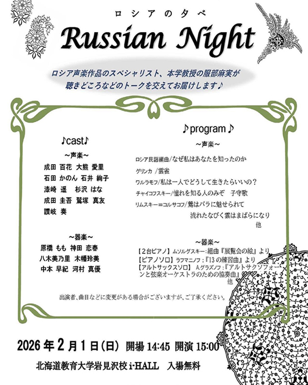 ロシアの夕べRussian Night 2月1日(日)15:00 北海道教育大学岩見沢校i・HALL(岩見沢市緑が丘2丁目34-1) 出演 ~声楽~ 成田 百花、大熊 愛里、石田かのん、石井 絢子、漆崎 遥、杉沢 はな、成田 圭吾、鷲塚 真友、讃岐 奏 ~器楽~ 原橋 もも、神田 恋春、八木美乃里、木幡 玲美、中本 早紀、河村 真優 ~トーク~ ききどころなどのトーク/服部 麻実(北海道教育大学岩見沢校教授) プログラム ~声楽~ ロシア民謡曲/なぜ私はあなたを知ったのか グリンカ/雲雀 ワルラモフ/私は一人でどうして生きたらいいの? チャイコフスキー/憧れを知る人のみぞ、子守歌 リムスキー=コルサコフ/鶯はバラに魅せられて 流れたなびく雲はまばらなり ‥‥他 ~器楽~ ムソルグスキー/組曲『展覧会の絵』より(2台ピアノ) ラフマニノフ/『13の練習曲』より(ピアノソロ) A.グラズノフ/『アルトサクソフォーンと弦楽器オーケストラのための協奏曲』‥‥他 |