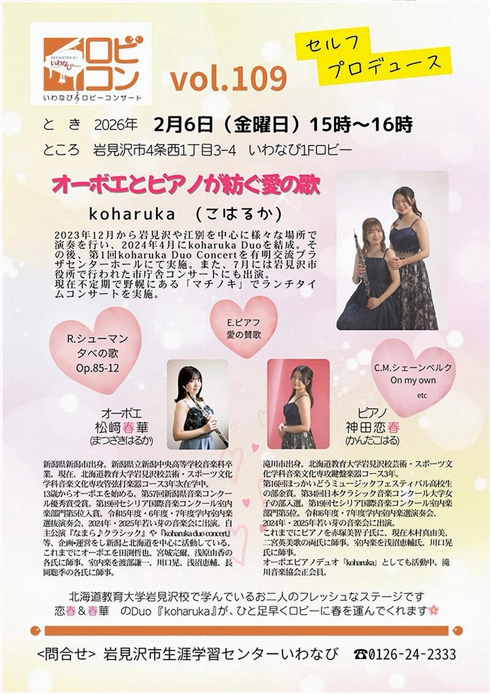 いわなびロビーコンサートVol.109オーボエとピアノが紡ぐ愛の歌 koharuka(こはるか) 2月6日(金)15:00~16:00 いわなび1Fロビー(岩見沢市4条西1丁目3-4) 出演 オーボエ/松崎 春華(北海道教育大学岩見沢校芸術・スポーツ文化学科音楽文化専攻管弦打楽器コース3年次在学中) ピアノ/神田 恋春(北海道教育大学岩見沢校芸術・スポーツ文化学科音楽文化専攻管弦打楽器コース3年) 曲目 R.シューマン/夕べの歌Op.85-12 E.ピアフ/愛の賛歌 C.M.シェーンベルク/On my own ‥‥etc. |