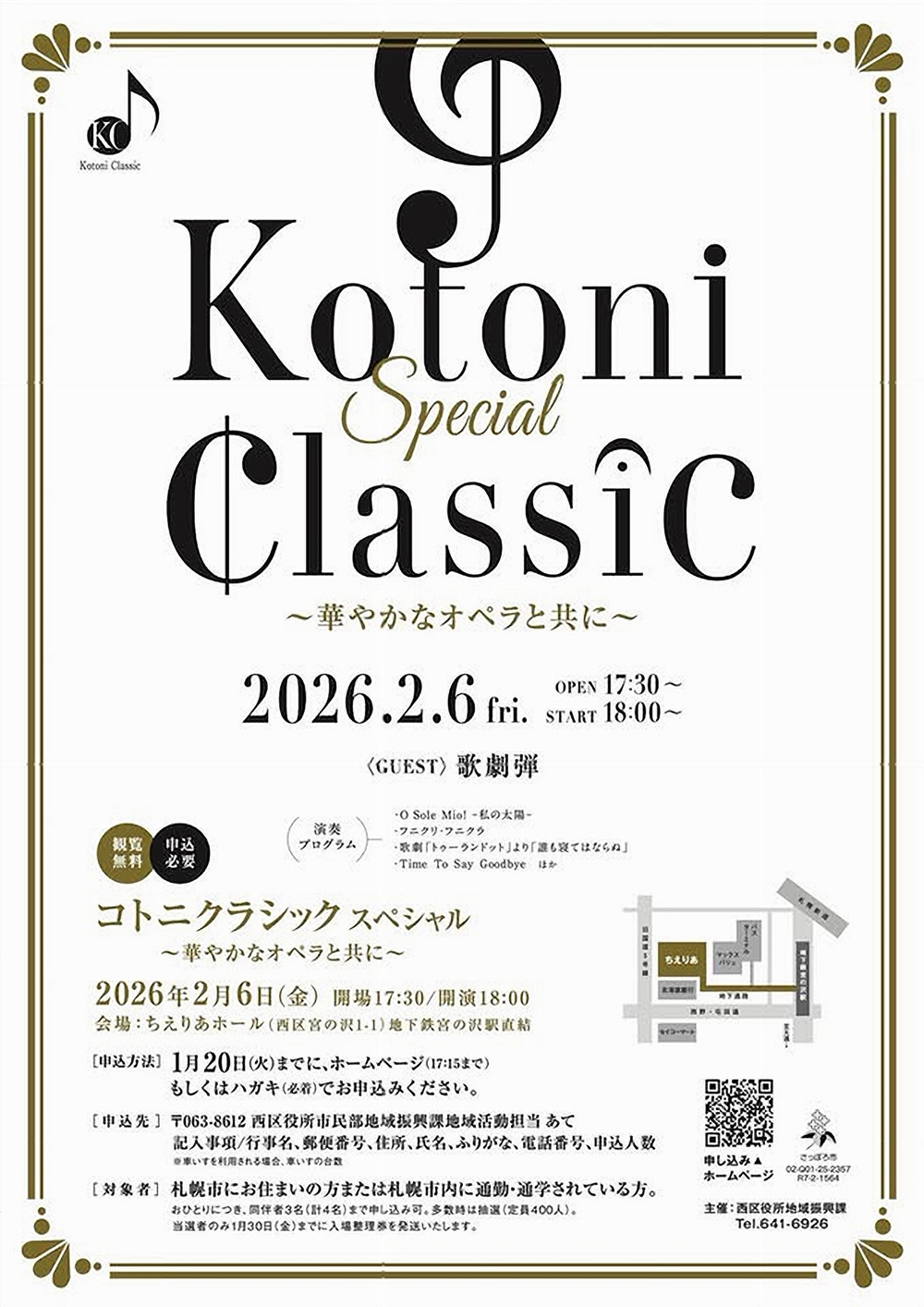 Kotoni Classic Special~華やかなオペラと共に~ 2月6日(金)18:00 ちえりあホール(札幌市生涯学習センター、札幌市西区宮の沢1条1丁目1-10) 出演 GUEST/歌劇弾 曲目 E.D.カプア=A.マッツッキ/O Sole Miel-私の太陽- ルイージ・デンツァ/フニクリ・フニクラ ジャコモ・プッチーニ/歌劇『トゥーランドット』より「誰も寝てはならぬ」 F.サルトーリ/Time To Say Goodbye ‥‥ほか |