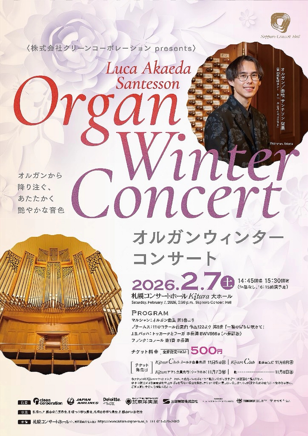 株式会社クリーンコーポレーションpresentsオルガン ウィンターコンサート オルガンから降り注ぐ、あたたかく艶やかな音色 2月7日(土)15:30~16:15 札幌コンサートホールKitara大ホール 出演 オルガン/赤枝 サンテソン 留果(第26代札幌コンサートホール専属オルガニスト) プログラム マルシャン/オルガン曲集第1巻より プラン・ジュ フーガ テノールの三度管 レシ フォン・ドルグ ディアローグ ブラームス/『11のコラール前奏曲作品122』より「第8曲 一輪のばらは咲きて」 J.S.バッハ/前奏曲とフーガホ長調BWV566a(ハ長調版) フランク/コラール第1番ホ長調 |