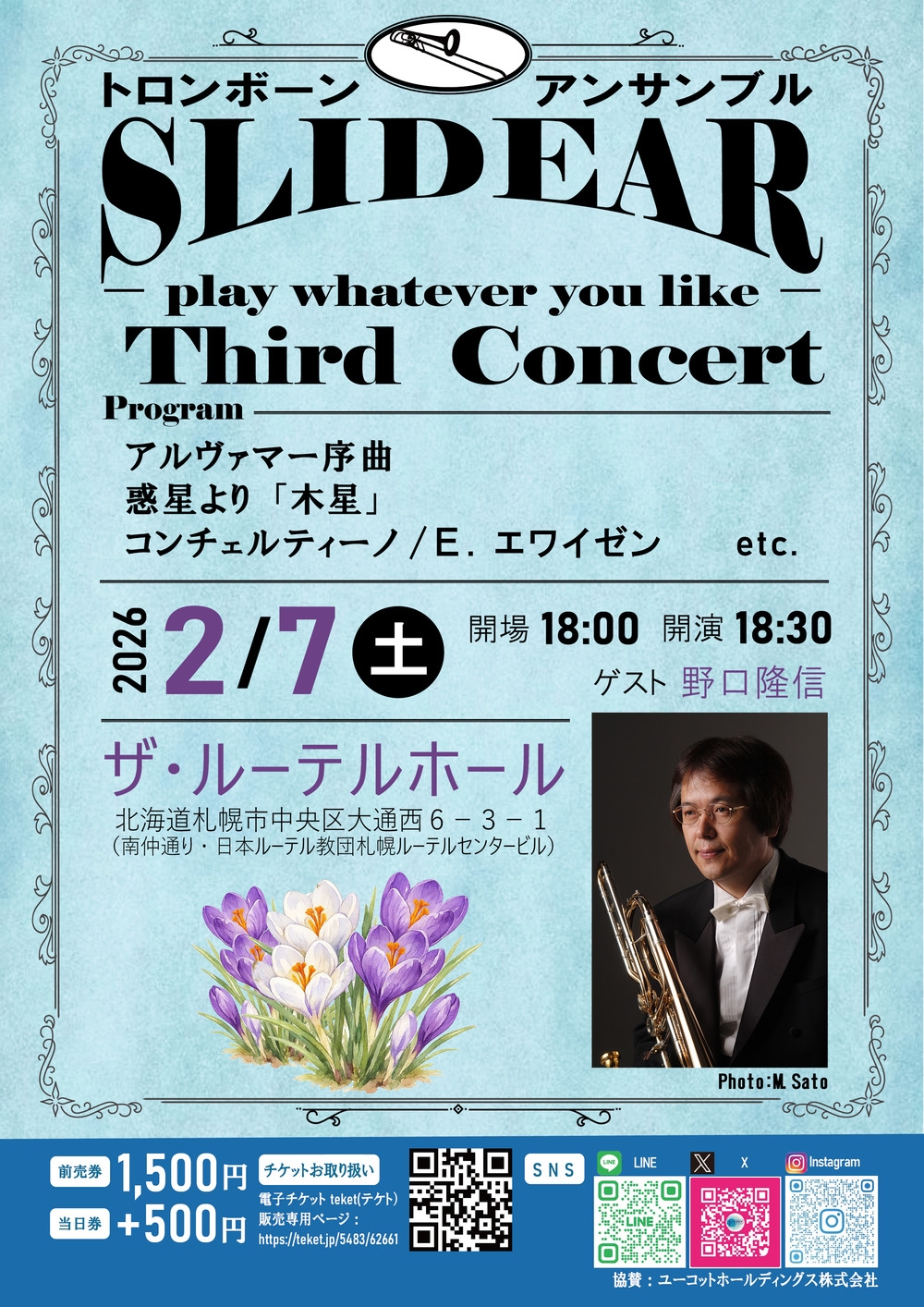 トロンボーンアンサンブルSLID EAR -play whatever you Like- Third Concert 2月7日(土)18:30 ザ・ルーテルホール(札幌市中央区大通西6丁目3-1) 出演 トロンボーン/野口 隆信(ゲスト。元札響トロンボーン奏者) 演奏/トロンボーンアンサンブル SLID EAR 曲目 J.バーンズ/アルヴァマー序曲 G.ホルスト/組曲『惑星』より「木星」 E.エワイゼン/コンチェルティーノ ‥‥etc. |