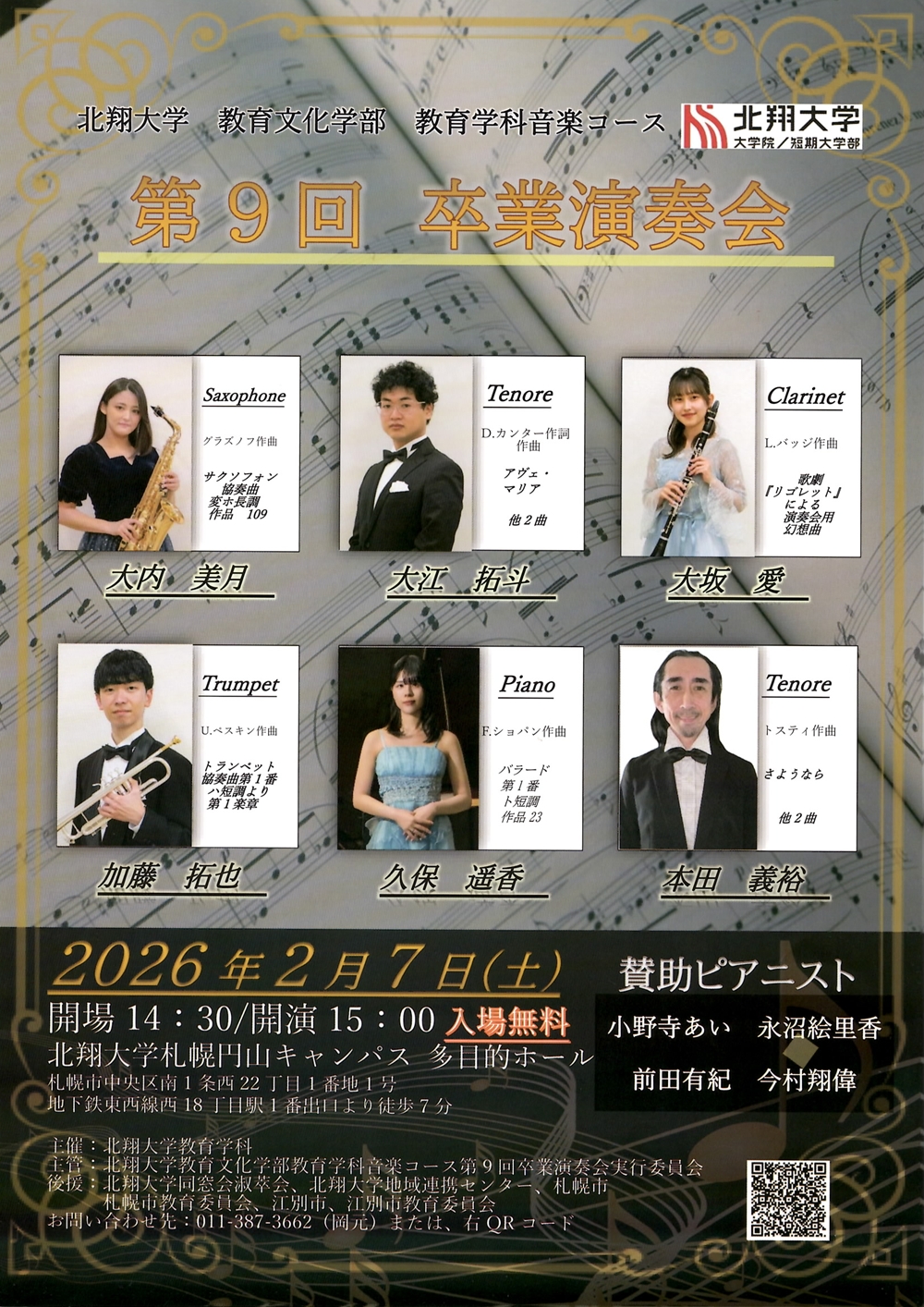 第9回卒業演奏会 2月7日(土)15:00 北翔大学札幌円山キャンパス(札幌市中央区南1条西22丁目1-1) 出演者・演奏曲 ・サクソフォン/大内 美月 Kotoni グラズノフ/サクソフォン協奏曲変ホ長調作品109 ・テノール/大江 択斗 カンター作詞・作曲/アヴェ・マリア 他2曲 ・クラリネット/大坂 愛 L.バッジ/歌劇「リゴレット」による演奏会用幻想曲 ・トランペット/加藤 拓也 U.ペスキン/トランペット協奏曲第1番ハ短調より第1楽章 ・ピアノ/久保 遥香 F.ショパン/バラード第1番ト短調作品31 ・テノール/本田 義裕 トスティ/さよなら 他2曲 賛助ピアニスト 小野寺あい、永沼絵里香、前田 有紀、今村 翔偉 |