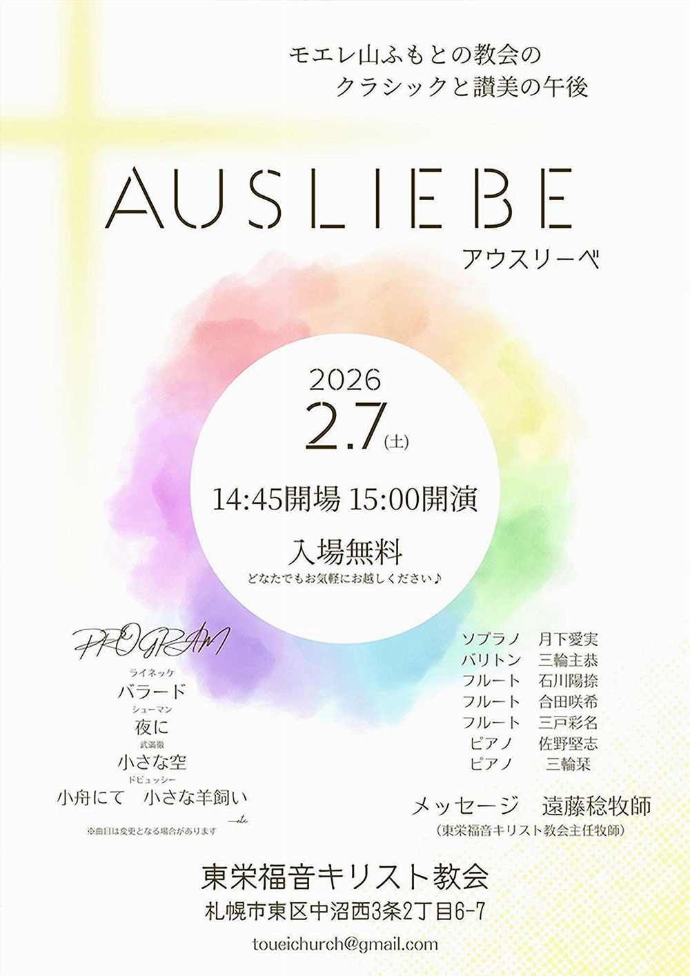 AUSLIEBEアウスリーペ もえれ山ふもとの教会の クラシックと賛美の午後 2月7日(土)15:00 東栄福音キリスト教会(札幌市東区中沼西3条2丁目6-7) 出演 ソプラノ/月下 愛実 バリトン/三輪 主恭 フルート/石川 陽捺 フルート/会田 咲希 フルート/三戸 彩名 ピアノ/佐野 堅志 ピアノ/三輪 栞 メッセージ/遠藤 稔牧師 曲目 ライネッケ/バラード シューマン/夜に 武満徹/小さな空 ドビュッシー/小舟にて ドビュッシー/小さな羊飼い ‥‥etc. |