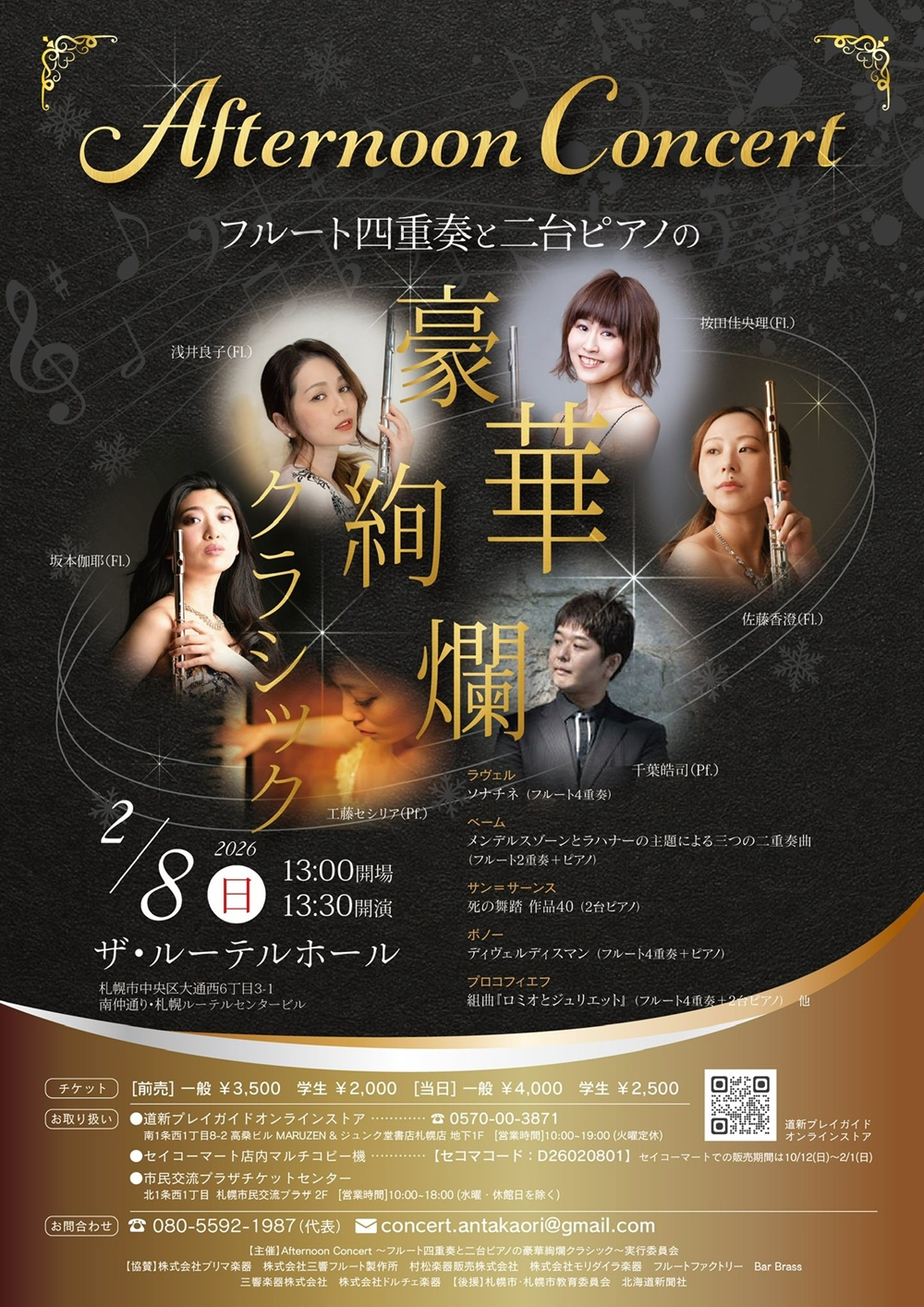 Afternoon Concertフルート四重奏と二台のピアノの 豪華絢爛クラシック 2月8日(日)13:30 ザ・ルーテルホール(札幌市中央区大通西6丁目3-1) 出演 フルート/按田佳央理(フリーランスフルート奏者) フルート/浅井 良子(浅井涼子フルート教室主催) フルート/坂本 伽耶(フリーランスフルート奏者) フルート/佐藤 香澄(三響楽器フルート講師) ピアノ/工藤セシリア(フリーランスピアノ奏者) ピアノ/千葉 皓司(NHK札幌放送局制作番組「北の文芸館」ピアノ演奏担当) 曲目 ラヴェル/ソナチネ(フルート四重奏) ヘーム/」メンデルスゾーンとハナーの主題による三つの二重奏曲(フルート二重奏+ピアノ) サン=サーンス/死の舞踏作品40(2台ピアノ) ボノー/デヴェルディスマン(フルート四重奏+ピアノ) プロコフィエフ/組曲『ロミオとジュリエット』(フルート四重奏+2台ピアノ) ・・・他 |