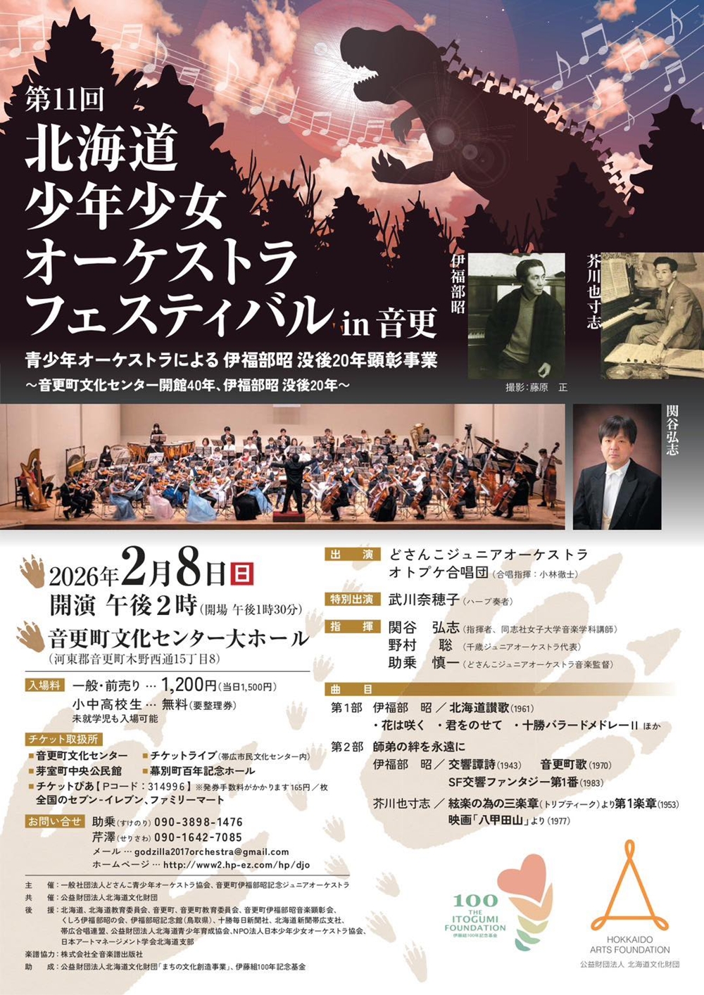 第11回北海道少年少女オーケストラフェスティバル in 音更 青少年オーケストラによる伊福部昭没後20年顕彰事業 ~音更町文化センター開館40年、伊福部昭没後20年~ 2月8日(日)14:00 音更町文化センター大ホール(河東郡音更町木野西通15丁目8) 出演 指揮/関谷 弘志(同志社大学音楽学科講師) 指揮/野村 聡(千歳ジュニアオーケストラ代表) 指揮/助乗 慎一(どさんこジュニアオーケストラ音楽監督) ハープ/武川奈穂子(特別出演。ハープ奏者) 管弦楽/どさんこジュニアオーケストラ 合唱/オトプケ合唱団(合唱指揮:小林 徹士) 曲目 第1部 伊福部昭/北海道賛歌(1961) 伊福部昭/花は咲く、君をのせて、十勝バラードメドレーⅡ ほか 第2部 伊福部昭/交響譚詩(1943) 伊福部昭/音更町歌(1970) 伊福部昭/SF交響ファンタジー第1番(1983) 芥川也寸志/弦楽のための三楽章(トリプティーク)より第1楽章(1953) 芥川也寸志/映画「八甲田山」より(1977) |