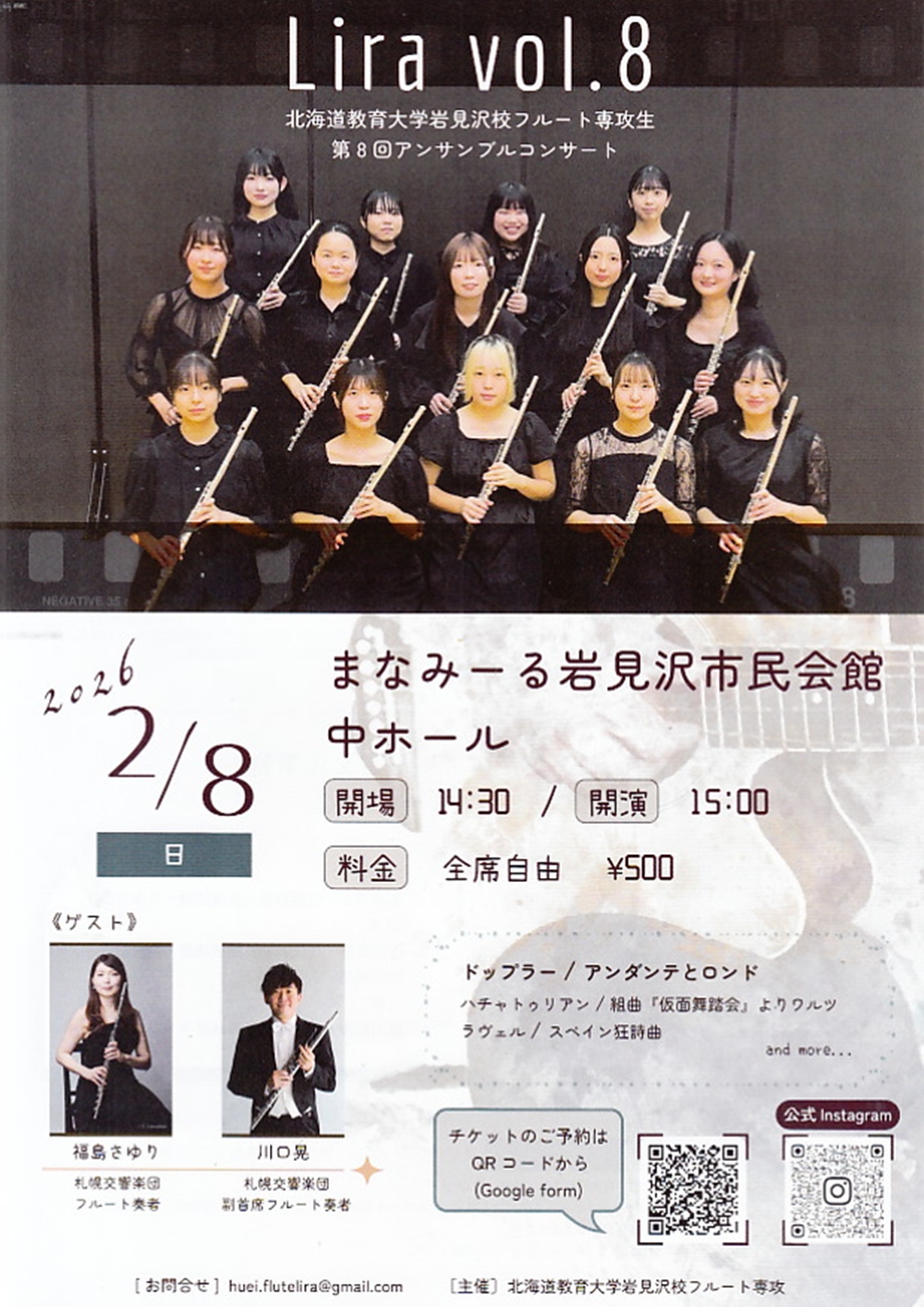 Lira Vol.8北海道教育大学岩見沢校フルート専攻生 第8回アンサンブルコンサート 2月8日(日)15;00 まなみーる岩見沢市民会館中ホール(岩見沢市9条西4丁目1-1) 出演 フルート/川口 晃(ゲスト。札響フルート副首席奏者) フルート/福島さゆり(ゲスト。札響フルート奏者) 北海道教育大学岩見沢校フルート専攻生 曲目 ドップラー/アンダンテとロンド ハチャトゥリアン/雲曲『仮面舞踏会』より「ワルツ」 ラヴェルスペイン狂詩曲 ‥‥and more... |