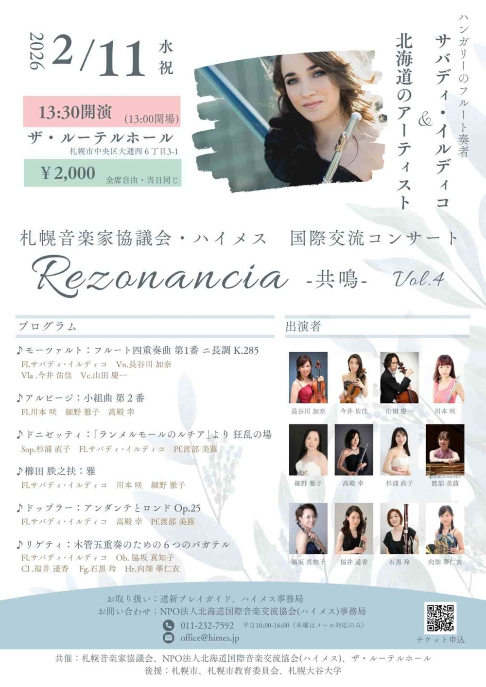 札幌音楽家協議会・ハイメス国際交流コンサート Rezonancia 共鳴Vol.4 2月11日(水)13:30~15:00 ザ・ルーテルホール(札幌市中央区大通西6丁目3-1) 出演 フルート/サバディ・イルディコ(《ゲスト》ハンガリー・ソルノク市立交響楽団フルート首席奏者) フルート/高殿 幸(札幌音楽家協議会・ハイメス) フルート/細野 雅子(札幌音楽家協議会) フルート/川本 咲(札幌音楽家協議会) クラリネット/福井 遥香(札幌音楽家協議会・ハイメス) オーボエ/脇坂真知子(札幌音楽家協議会) ホルン/向畑華仁衣(札幌音楽家協議会) ファゴット/石黒 玲(札幌音楽家協議会・ハイメス) ヴァイオリン/長谷川加奈(札幌音楽家協議会・ハイメス) ヴィオラ/今井 佑佳(札幌音楽家協議会・ハイメス) チェロ/山田 慶一(札幌音楽家協議会・ハイメス) ソプラノ/杉浦 直子(札幌音楽家協議会・ハイメス) ピアノ/渡部 美蕗(札幌音楽家協議会・ハイメス) プログラム モーツァルト/フルート四重奏曲第1番K.285 アルビージ/小組曲第2番 ドニゼッティ/『ランメルモールのルチア』より「狂乱の場」 櫛田?之扶/雅 ドップラー/アンダンテとロンド作品25 リゲティ/木管五重奏のための6つのバガテル |