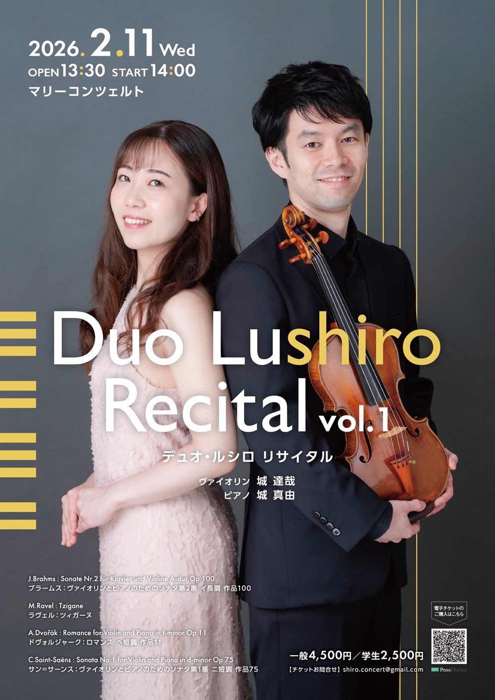 Duo LushiroRecitalVol.1 デュオ・ルシオ リサイタル 2月11日(水)14:00 マリーコンツェルト(東京都板橋区中板橋18-11) 出演 ヴァイオリン/城 達哉(しろミュージックアカデミー主宰) ピアノ/城 真由(カワイ音楽教室アドバイザー兼ピアニスト) 曲目 J.ブラームス/ヴァイオリンとピアノのためのソナタ第2番イ長調作品100 M.ラヴェル/ツィガーヌ A.ドヴォルジャーク/ロマンスヘ短調作品11 C.サン=サーンス/ヴァイオリンとピアノのためのソナタ第1番ニ短調作品75 |