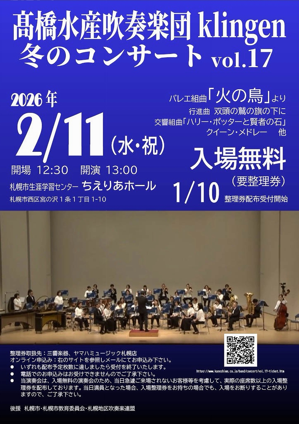 髙橋水産吹奏楽団klingen冬のコンサートVol.17 2月11日(水・祝)13:00~14:30 ちえりあホール(札幌市生涯学習総合センター。札幌市西区宮の沢1条1丁目1-10) 出演 吹奏楽/髙橋水産吹奏楽団klingen 曲目 ストラヴィンスキー/バレエ組曲『火の鳥』より「行進曲」「双頭の鷲の旗の下に」 J.ウィリアムズ/交響組曲「ハリー・ポッターと賢者の石」 フレディ・マーキュリー=ブライアン・メイ/クイーン・メドレー ‥‥他 |
