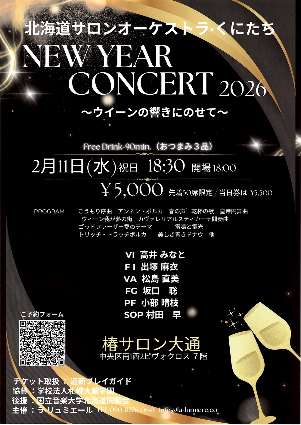 NEW YEAR CONCERT 2026 ~ウィーンの響きにのせて~ Free Drink 90min.(おつまみ3品) 2月11日(水・祝)18:30 椿サロン大通(札幌市中央区南1条西2丁目9-1ピヴォクロス7階) 出演 チェロ/高井みなと フルート/出塚 麻衣 ヴァイオリン/松島 直美 ファゴット/坂口 聡(札響ファゴット首席奏者) ピアノ/小部 晴枝 ソプラノ/村田 早 曲目 ヨハン・シュトラウス2世/こうもり序曲 ヨハン・シュトラウス2世/アンネン・ポルカ ヨハン・シュトラウス2世/春の声 ジュゼッペ・ヴェルディ/乾杯の歌 ヨハン・シュトラウス2世/皇帝円舞曲 R.ジーツィンスキー/ウィーン我が夢の街 P.マスカーニ./カヴァレリア・ルスティカーナ間奏曲 N.ロータ/映画「ゴッドファーザー」愛のテーマ ヨハン・シュトラウス2世/雷鳴と雷光 ヨハン・シュトラウス2世//トリッチ・トラッチ・ポルカ ヨハン・シュトラウス2世/美しき青きドナウ ‥‥他 |