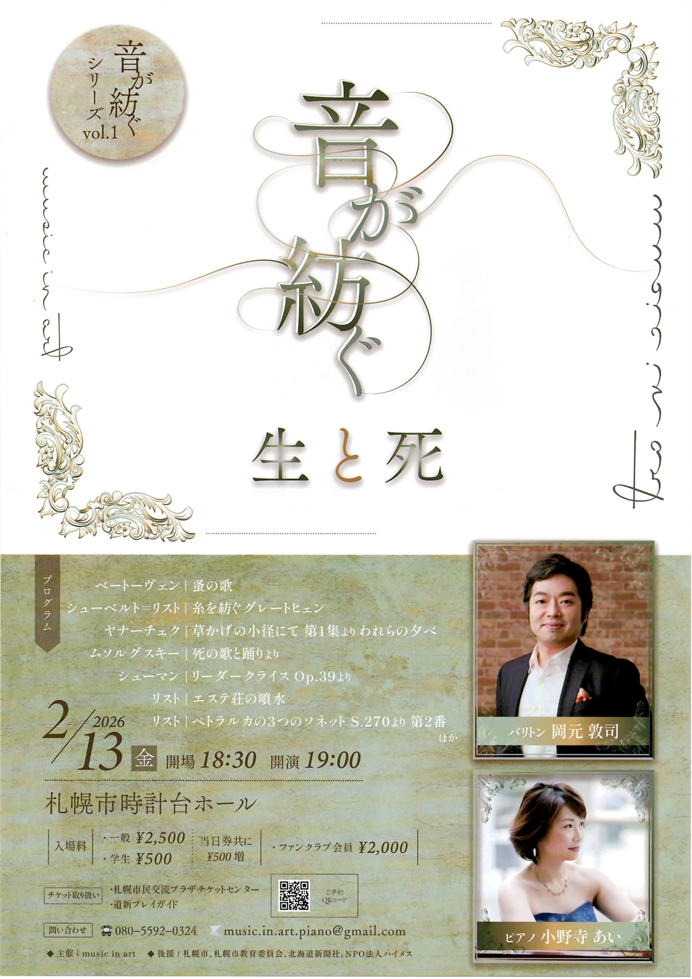 音が紡ぐ生と死 2月13日(金)19:00 札幌市時計台ホール(札幌市中央区北1条西2丁目) 出演 バリトン/岡元 敦司(北海道二期会理事) ピアノ/小野寺あい(music in art代表) プログラム ベートーヴェン/蚤の歌 シューベルト=リスト/糸を紡ぐグレートヒェン ヤナーチェク/『草かげの小径にて第1集』より「われらの夕べ」 ムソルグスキー/死の歌と踊りより シューマン/リーダークライスOp.39より リスト/エステ荘の噴水 リスト/ペトラルカの3つのソネットS.270より第2番 ……ほか |