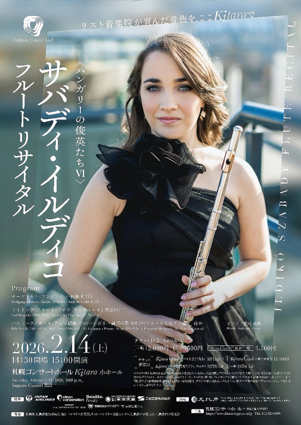 ハンガリーの俊英たちⅥサバディ・イルディコ フルートリサイタル リスト音楽院が育んだ美しき音色を、ここKitaraで 2月14日(土)15:00 札幌コンサートホールKitara小ホール 出演 フルート/サバディ・イルディコ ピアノ/荒川 浩毅(第22回リスト音楽院セミナー審査員特別賞) プログラム ロレンツォ/フランツ・リストの狂詩曲第2番によるカデンツァ作品37 ルクレール/フルート・ソナタト長調作品9-7 モーツァルト/アンダンテハ長調K.315 ライネッケ/フルート・ソナタ「ウンディーネ」作品167 ツィビン/コンサート・アレグロ第2番変イ長調 バルトーク(ポール・アルマ編曲)/15のハンガリー農民の歌BB 79(フルートとピアノ編) |