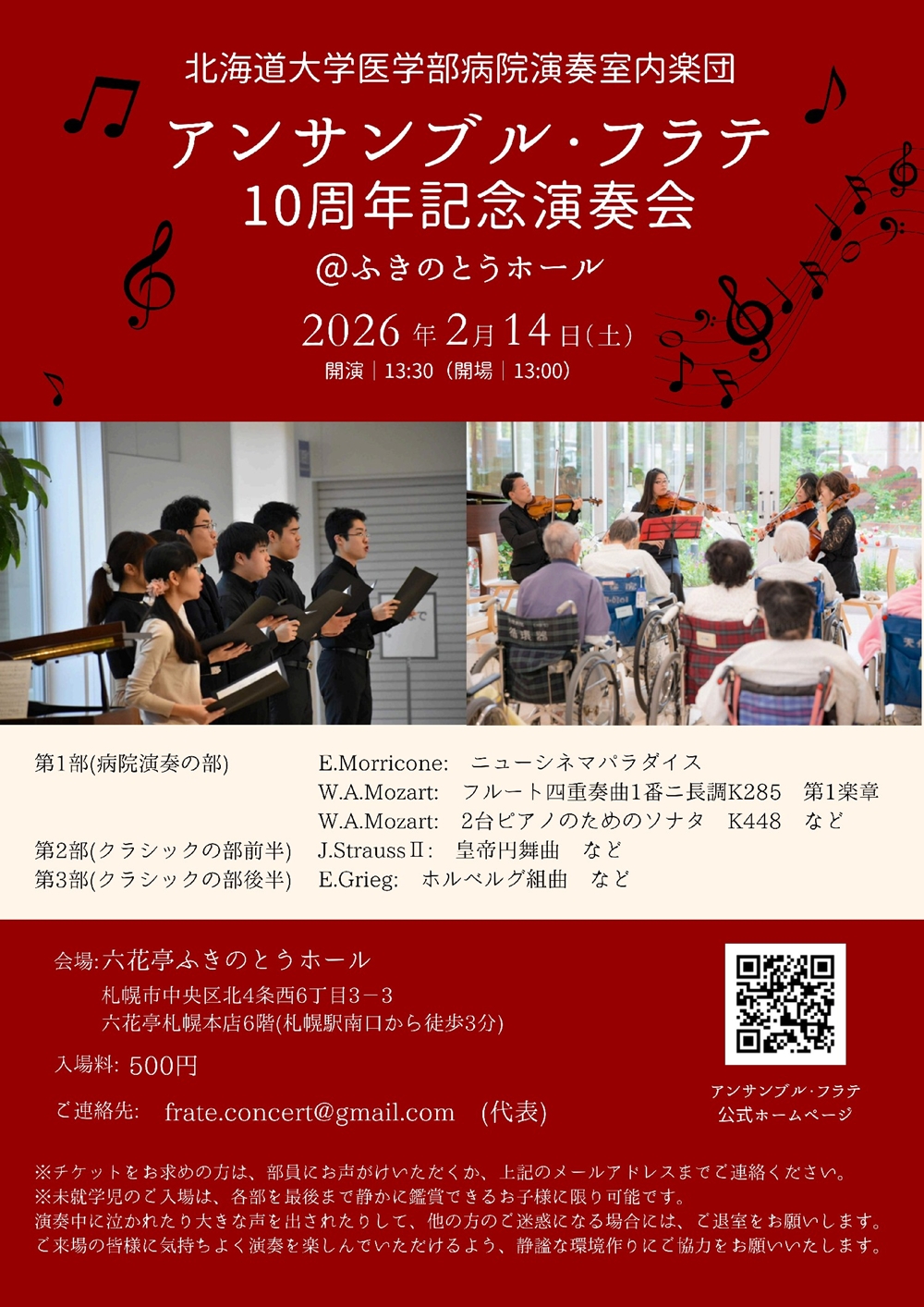 北海道大学医学部病院演奏室内楽団 アンサンブル・フラテ 10周年記念演奏会 2月14日(土)13:30 ふきのとうホール(札幌市中央区北4条西6丁目3-3六花亭札幌本店6階) 出演 管弦楽/北海道大学医学部病院演奏室内楽団アンサンブル・フラテ 曲目 E.モリコーネ/ニュー・シネマ・パラダイス W.A.モーツァルト/フルート四重奏曲第1番ニ長調K285 W.A.モーツァルト/2台ピアノのためのソナタK448 など J.シュトラウス二世/皇帝円舞曲 など E.グリーグ/ホルベルグ組曲 など |