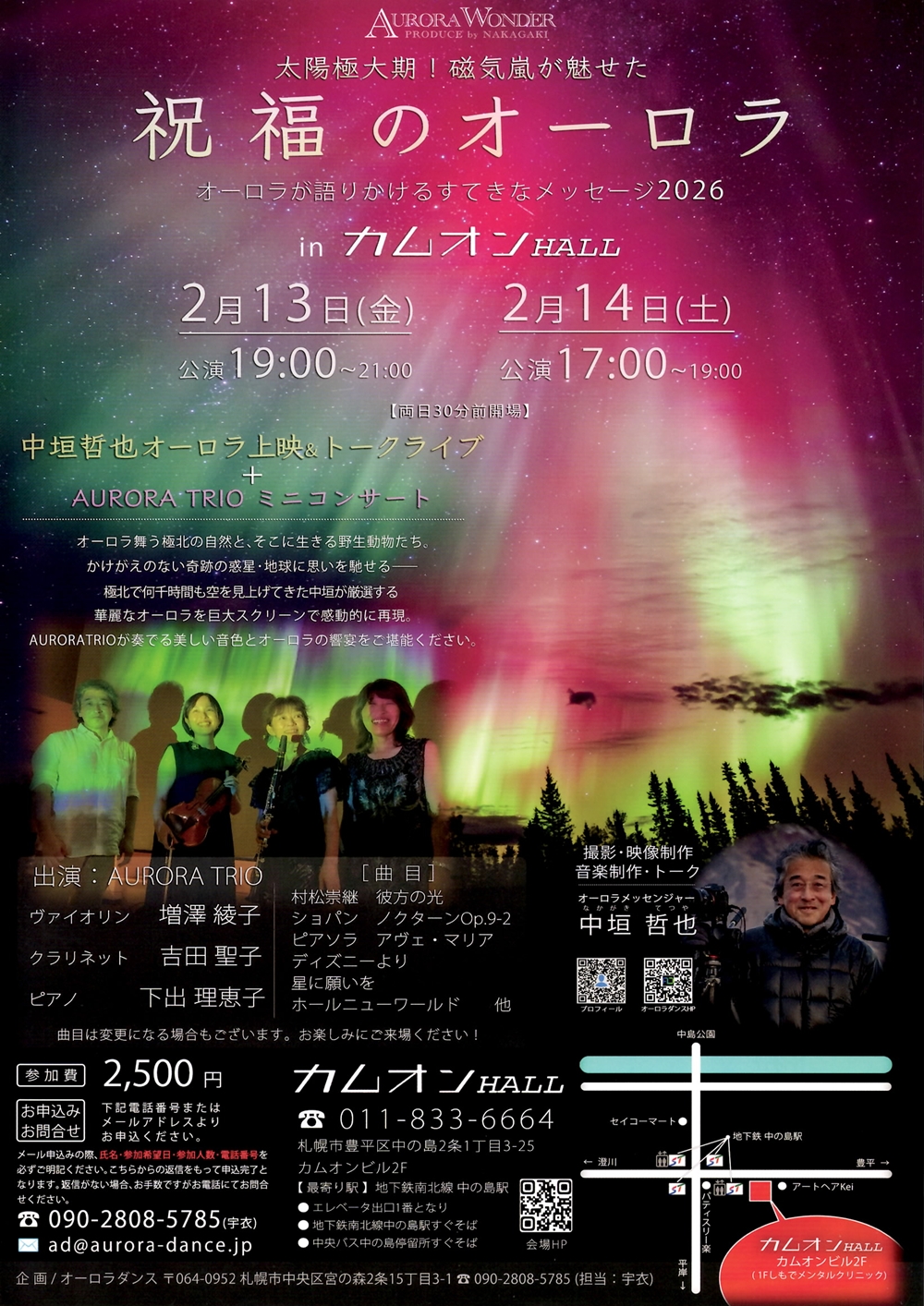 祝福のオーロラ オーロラが語りかけるすてきなメッセージ2026 in カムオンHALL 中垣哲也オーロラ上映&トークライブ + AURORA TRIO ミニコンサート 2月13日(金)19:00 2月14日(土)17:00 カムオンHALL(豊平区中の島2条1丁目13-25カムオンビル2F) 出演 撮影・映像&音楽制作・トーク/中垣 哲也(オーロラメッセンジャー) AURORA TRIO ヴァイオリン/増澤 綾子 クラリネット/吉田 聖子 ピアノ/下出理恵子 曲目 村松崇継/彼方の光 ショパン/ノクターンOp.9-2 ピアソラ/アヴェ・マリア A.メンケン/ディズニーより リー・ハーライン/星に願いを A.メンケン/ホール・ニュー・ワールド ‥‥他 |