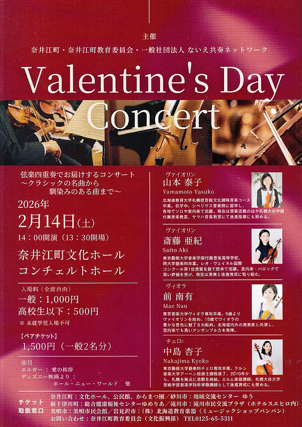 Valentin's Day Concert弦楽四重奏でお届けするコンサート ~クラシックの名曲から なじみのある曲まで~ 2月14日(土)14:00 奈井江町文化ホールコンチェルトホール 出演 ヴァイオリン/山本 泰子(ヤマハ音楽居室講師) ヴァイオリン/斎藤 亜紀 ヴィオラ/南 南有 チェロ/中島 杏子(エルム楽器講師) 曲目 エルガー/愛の挨拶 アラン・メンケン/『ディズニー映画』より「ホール・ニュー・ワールド」 ‥‥他 |