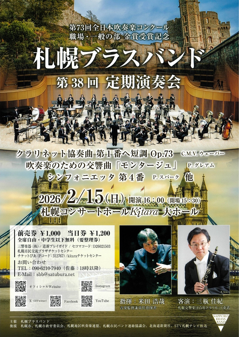 第73回全日本吹奏楽コンクール職場・一般の部金賞受賞記念 札幌ブラスバンド 第38回定期演奏会 2月15日(日)16:00~18:00 札幌コンサートホールKitara大ホール 出演 指揮/米田 浩哉(音楽監督兼常任指揮者) クラリネット/三瓶 佳紀(札響クラリネット首席奏者) 吹奏楽/札幌ブラスバンド 曲目 C.M.V.ウェーバー/クラリネット協奏曲第1番ヘ短調Op.73 P.グレアム/吹奏楽のための交響曲「モンタージュ」 P.スパーク/シンフォニエッタ第4番 ・・・他 |