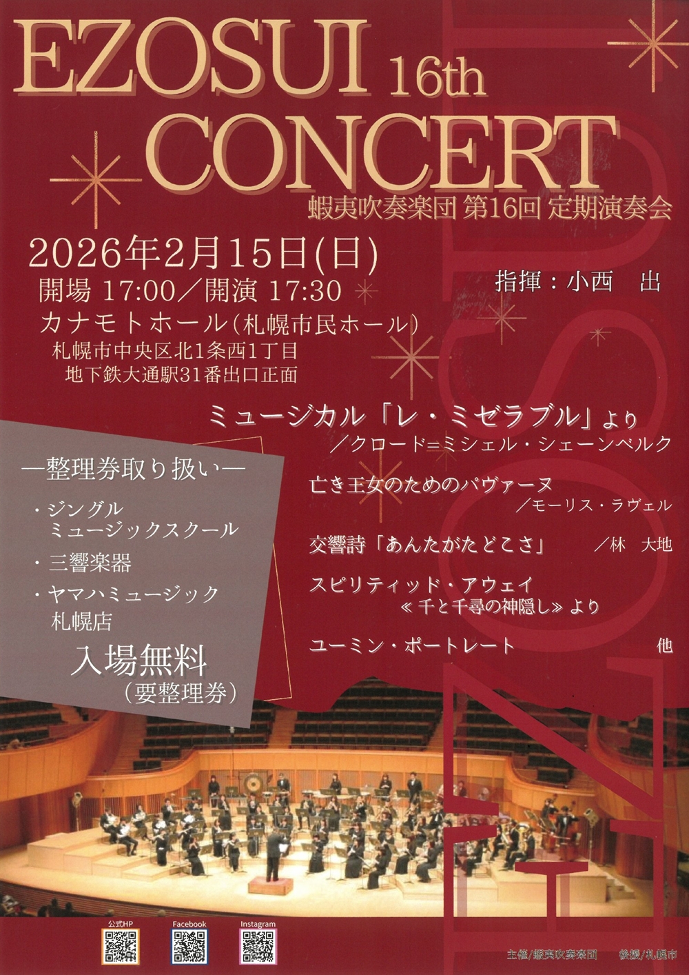 EZOSUI 16th CONCERT蝦夷吹奏楽団 第16回定期演奏会 2月15日(日)17:30 カナモトホール(札幌市民ホール。札幌市中央区北1条西1丁目) 出演 指揮/小西 出(ジングルミュージックスクールトランペット科講師) 吹奏楽/EZOSUI-蝦夷吹奏楽団 曲目 クロード=ミシェル・シェーンベルク/ミュージカル「レ・ミゼラブル」より モーリス・ラヴェル/亡き女王のためのパヴァーヌ 林 大地/交響詩「あんたがたどこさ」 久石 譲/映画『千と千尋の神隠し』より「スピリティッド・アウェイ」 荒井由実/ユーミン・ポートレート …他 |