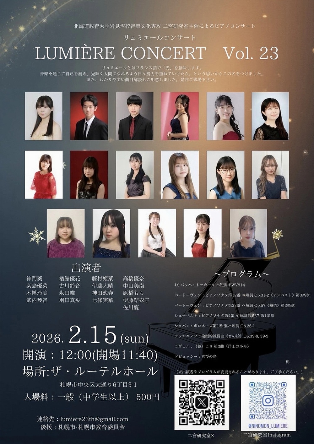 北海道教育大学岩見沢校音楽文化専攻二宮研究室主催によるピアノコンサート LUMIERE CONCERT Vol.23 リュミエールコンサート 2月15日(日)12:00 ザ・ルーテルホール(札幌市中央区大鳥西6丁目3-1) 出演(ピアノ) 神門 葵、樽舘 優花、藤村 姫菜、高橋 優奈、棄島 優菜、古島 鈴音、伊藤 大晴、中山 美南、木幡 玲美、 永田 唯、神田 恋春、原橋 もも、竹内 琴音、羽田 真央、七条 実華、伊藤結衣子、佐川 慶 プログラム J.S.バッハ/トッカータホ短調BWV914 ベートーヴェン/ピアノ・ソナタ第17番ニ短調Op.31-2「テンペスト」第3楽章 ベートーヴェン/ピアノ・ソナタ第23番ヘ短調Op.57「情熱」第3楽章 シューベルト/ピアノ・ソナタ第第4番イ短調D.537第1楽章 ショパン/ポロネーズ第1番嬰ハ短調Op.26-1 ラフマニノフ/絵画的練習曲『音の絵』Op.39-8.39-9 ラヴェル/『鏡』より第3曲「洋上の小舟」 ドビュッシー/喜びの島 ‥‥他 |