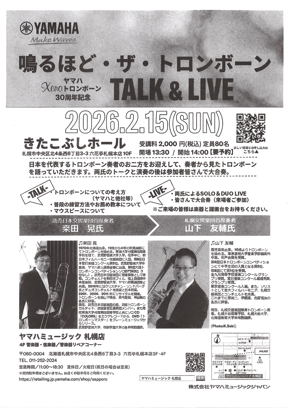 鳴るほど・ザ・トロンボーン ヤマハXenoトロンボーン30周年記念 TALK & LIVE 2月15日(日)14:00 きたこぶしホール(札幌市中央区北4条西6丁目3-3六花亭札幌本店10階) 出演 トロンボーン/桒田 晃(読売日本交響楽団トロンボーン首席奏者) トロンボーン/山下 友輔(札響トロンボーン首席奏者) ピアノ/二階堂瑞穂 -TALK- トロンボーンについての考え方ほか(ヤマハと他社等) -LIVE- 両氏によるSOLO&DUO LIVE及び皆さんで大合唱(来場者参加) |