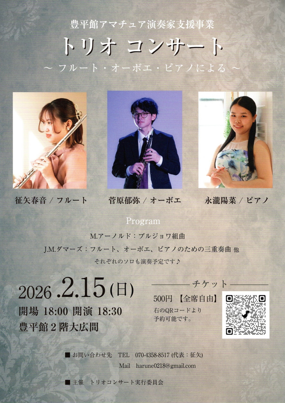 豊平館アマチュア演奏家支援事業トリオ コンサート ~フルート・オーボエ・ピアノによる~ 2月15日(日)18:30 豊平館大2階広間(札幌市中央区中島公園Ⅰ-20) 出演 フルート/征矢 春音(北海道境域大学岩見沢校管打楽器コース3年在学中) オーボエ/菅原 郁弥(北海道境域大学岩見沢校打楽器コース4年在学中) ピアノ/永瀧 陽菜(北海道境域大学岩見沢校鍵盤楽器コース3年在学中) PROGRAM M.アーノルド/ブルジョワ組曲 J.M.ダマーズ/フルート、オーボエ、ピアノのための三重奏曲 ‥‥他 ※それぞれのソロも演奏予定です♪ |