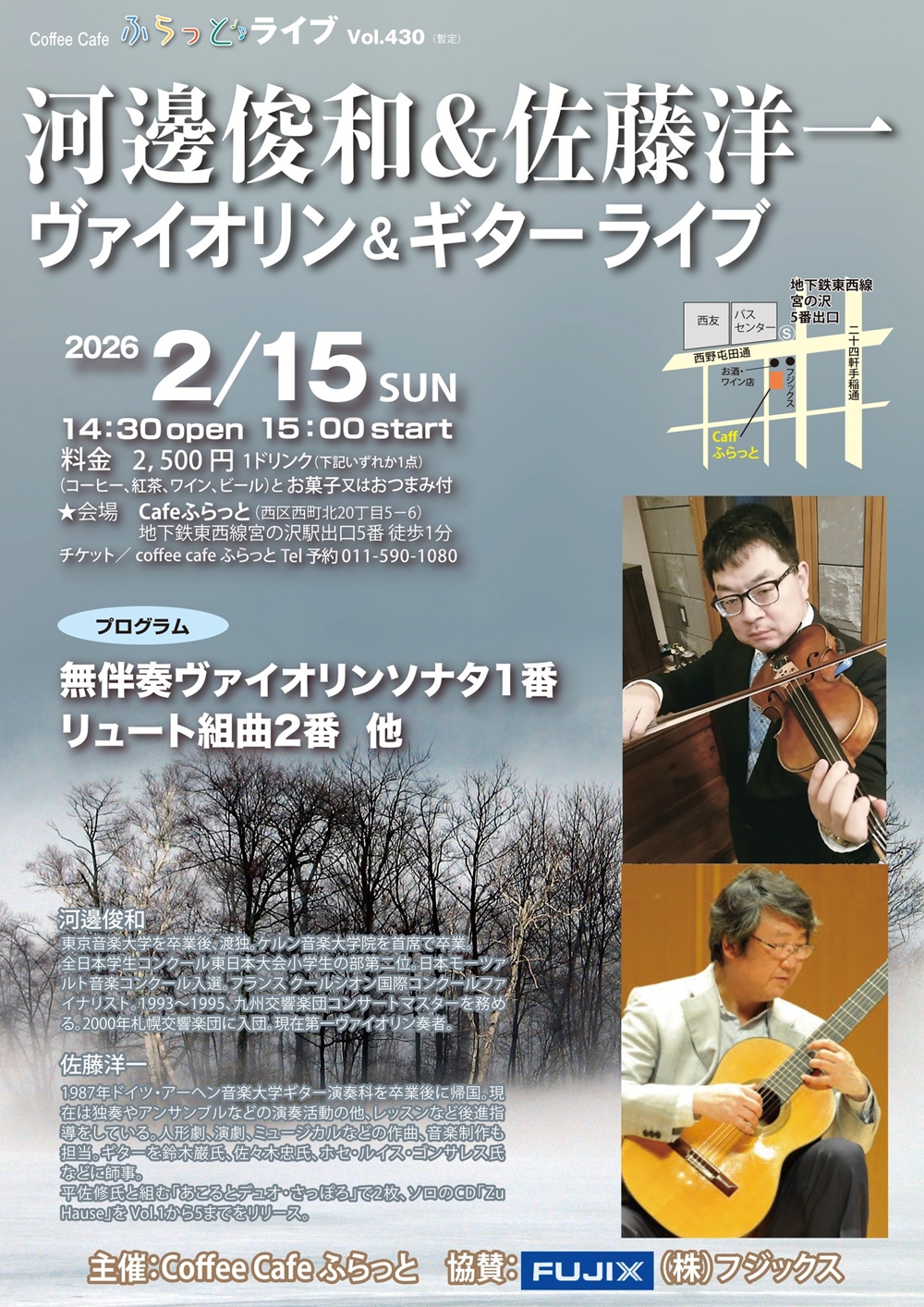 CoFFee Cafe ふらっとライブ河邉俊和&佐藤洋一 ヴァイオリン&ギターライブ 2月15日(日)15:00 Cafeふらっと(札幌市西区西町北20丁目5-6) 出演 ヴァイオリン/河邉 俊和(札響ヴァイオリン奏者) ギター/佐藤 洋一(ギター教室主宰) 曲目 J.S.バッハ/無伴奏ヴァイオリン・ソナタ第1番 J.S.バッハ/リュート組曲第2番 ‥‥他 |