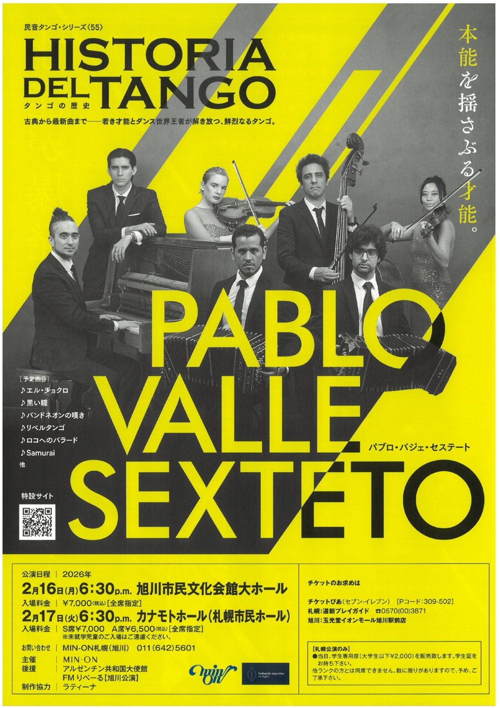 民音タンゴシリーズ<55>パブロ・バジェ・セステート ヒストリア・デル・タンゴ ~タンゴの歴史~ 旭川公演 2月16日(月)18:30 旭川市民文化会館大ホール(旭川市7条通9丁目50) 出演 歌手/ロドリゴ・モレル ダンサー/コンスタンサ&リカルド、ミカエラ&レアンドロ 楽団/パブロ・バジェ・セステート 曲目 アンヘル・ビジョルドエル・チェクロ フロリアン・ヘルマン/黒い瞳 フアン・デ・ディオス・フィリベルト/バンドネオンの嘆き アストル・ピアソラ/リベルタンゴ アストル・ピアソラ/ロコへのバラード 長渕剛/Samurai …他 |